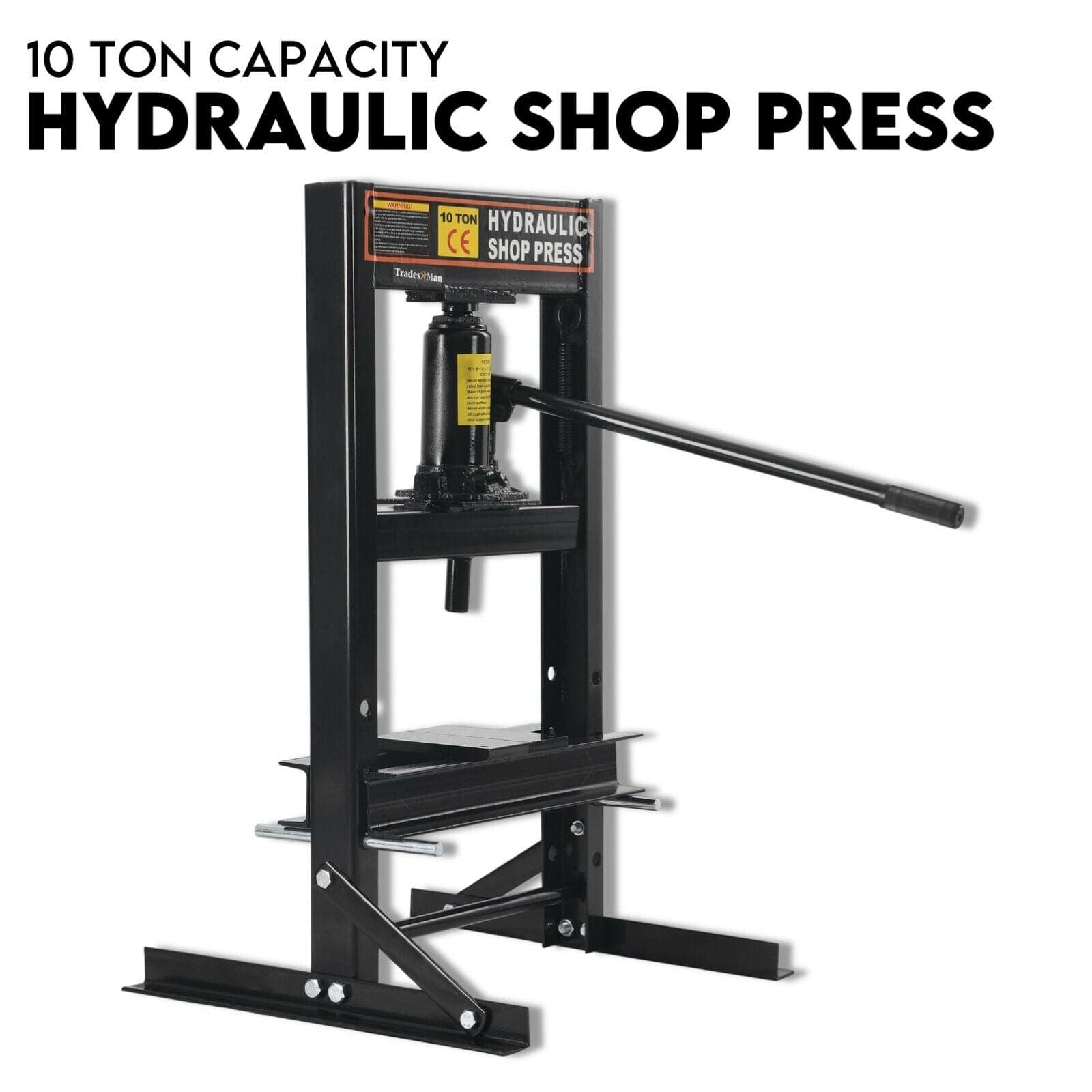 The TRADESMAN heavy-duty steel H-frame hydraulic garage/shop floor press is designed for straightening, bending, pressing bearings, installing bearings and stamping.The hydraulic cylinder is equipped with a 10-ton capacity bottle jack.