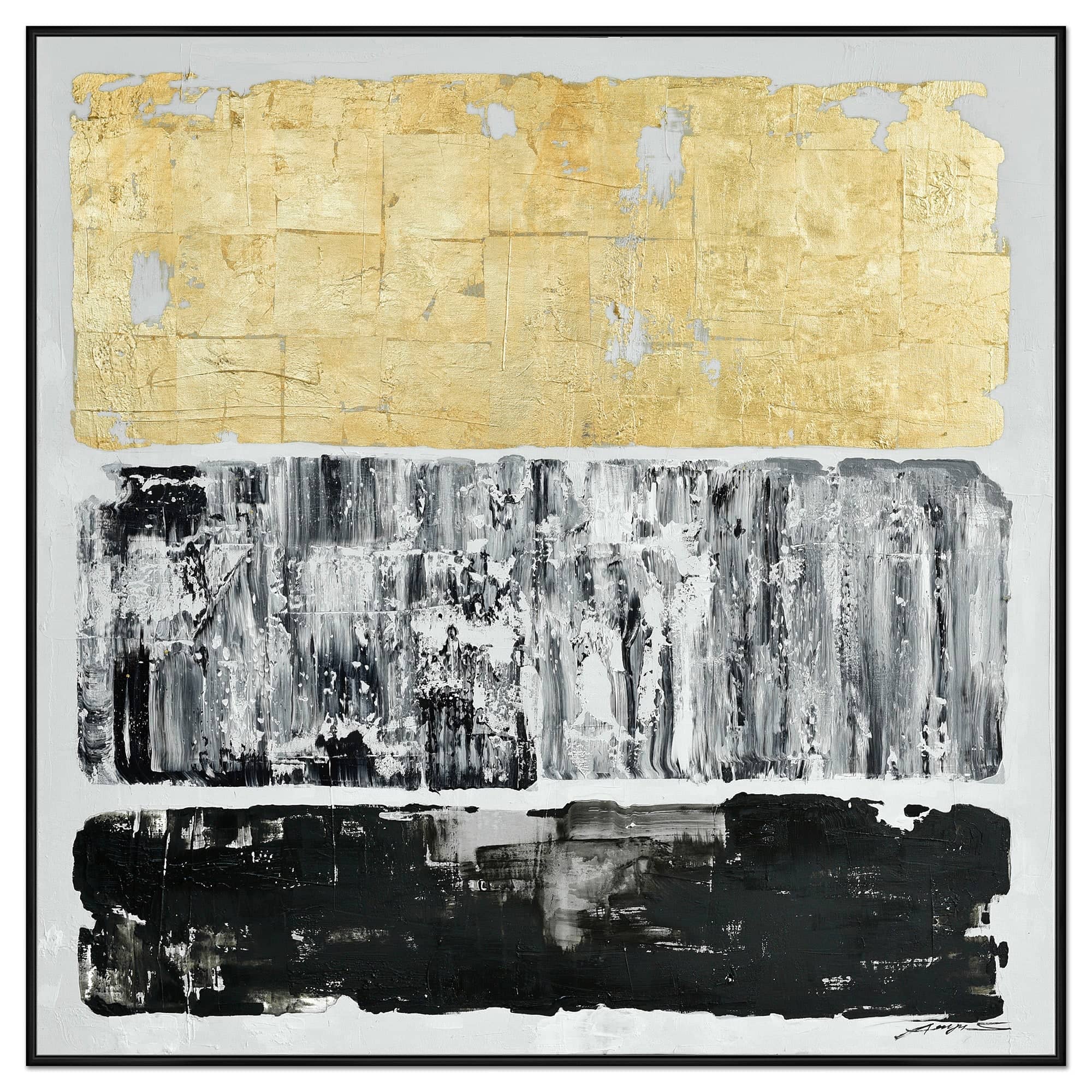 "Tonal Trilogy" is an art piece of striking simplicity and profound depth, measuring 120cm x 120cm. Divided into three distinct horizontal stripes, each segment tells its own story. The top section gleams with a luxurious gold, imbuing the canvas with warmth and opulence. This transitions into the central stripe, a unique blend of white-washed black that marries light and shadow. The composition culminates with a pure black stripe at the bottom, offering a grounding contrast. Each of these sections is immaculately defined by straight-cut white edges, which not only distinguish the stripes but also add a crisp, contemporary touch. Encased in a sleek black frame, "Tonal Trilogy" exemplifies modern abstract art, balancing bold contrasts with harmonious continuity.