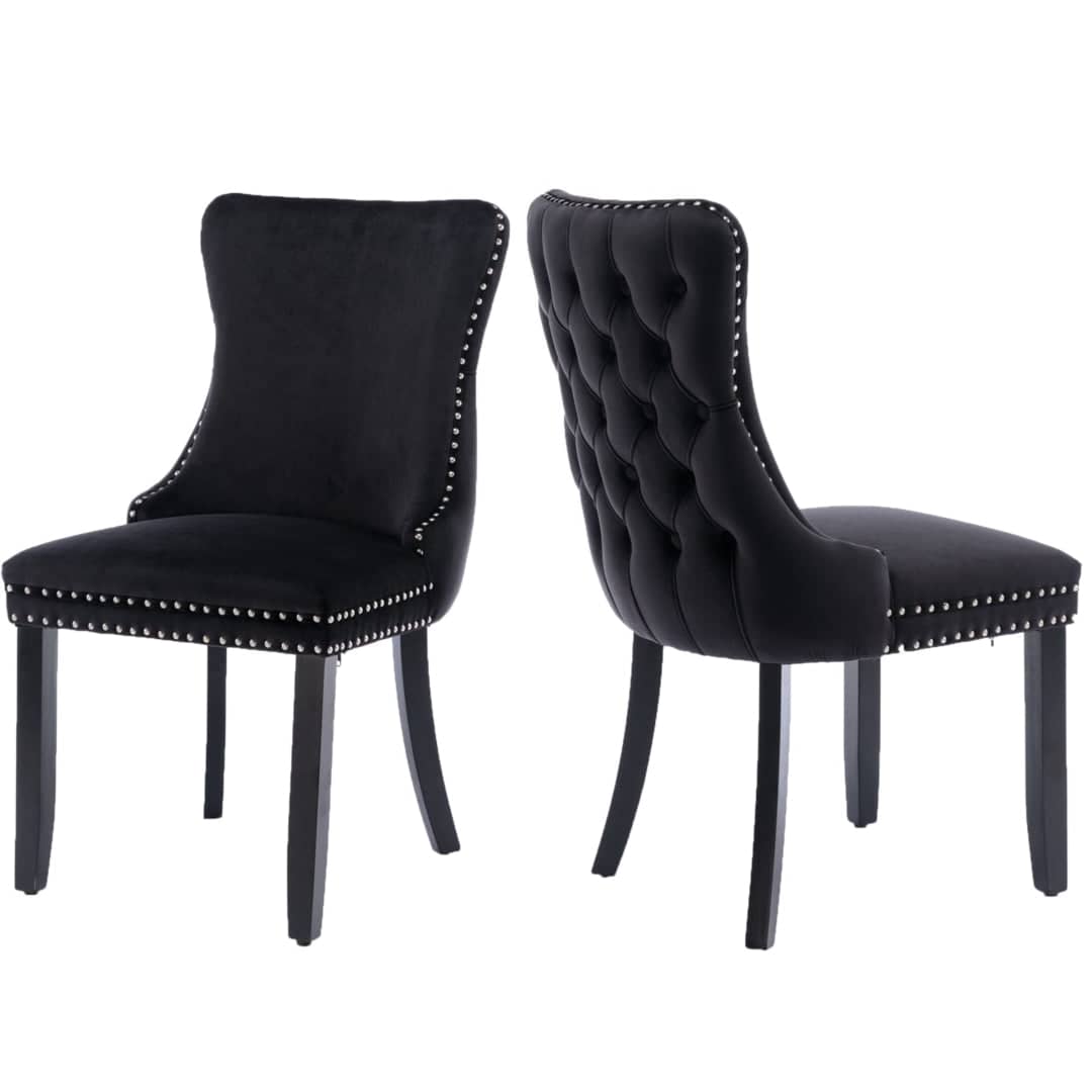 2x Velvet Upholstered Dining Chairs Tufted Wingback Side Chair with Studs Trim Solid Wood Legs for Kitchen