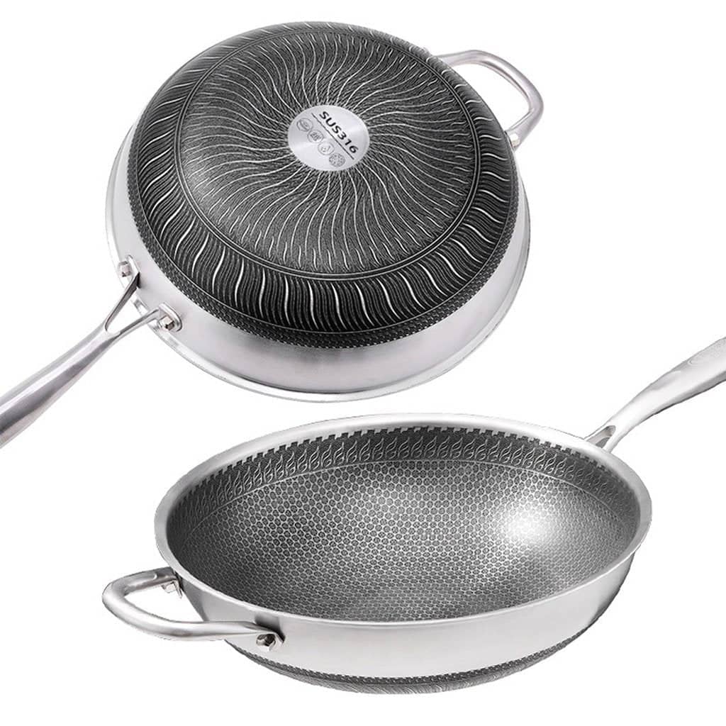 316 Stainless Steel Non-Stick Stir Fry Cooking Kitchen Wok Pan with Lid Honeycomb Double Sided