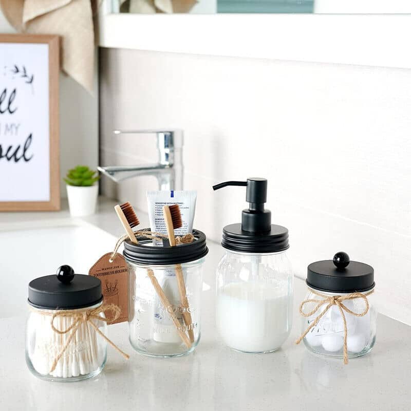 LUXURY FUNCTIONAL BATH ACCESSORY SET - 4 piece farmhouse rustic decor design mason jar bathroom set, perfect for organizing your bathroom or adding style to your room. Ideal decoration fits various styles: rustic decor, industrial style, western decor, morden style, contemporary decor, country decor. Ideal bathroom accessories set for home decor, bathroom decor, farmhouse decor. Great for the kitchen and bath, for countertop organize, vanity top, makeup table and craft.