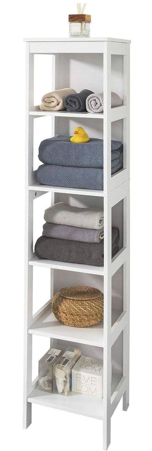 - Add extra storage to your bathroom with this stylish white shelf. Perfect for storing towels, toiletries, and other necessities, this shelf is a great way to keep your bathroom neat and organized.