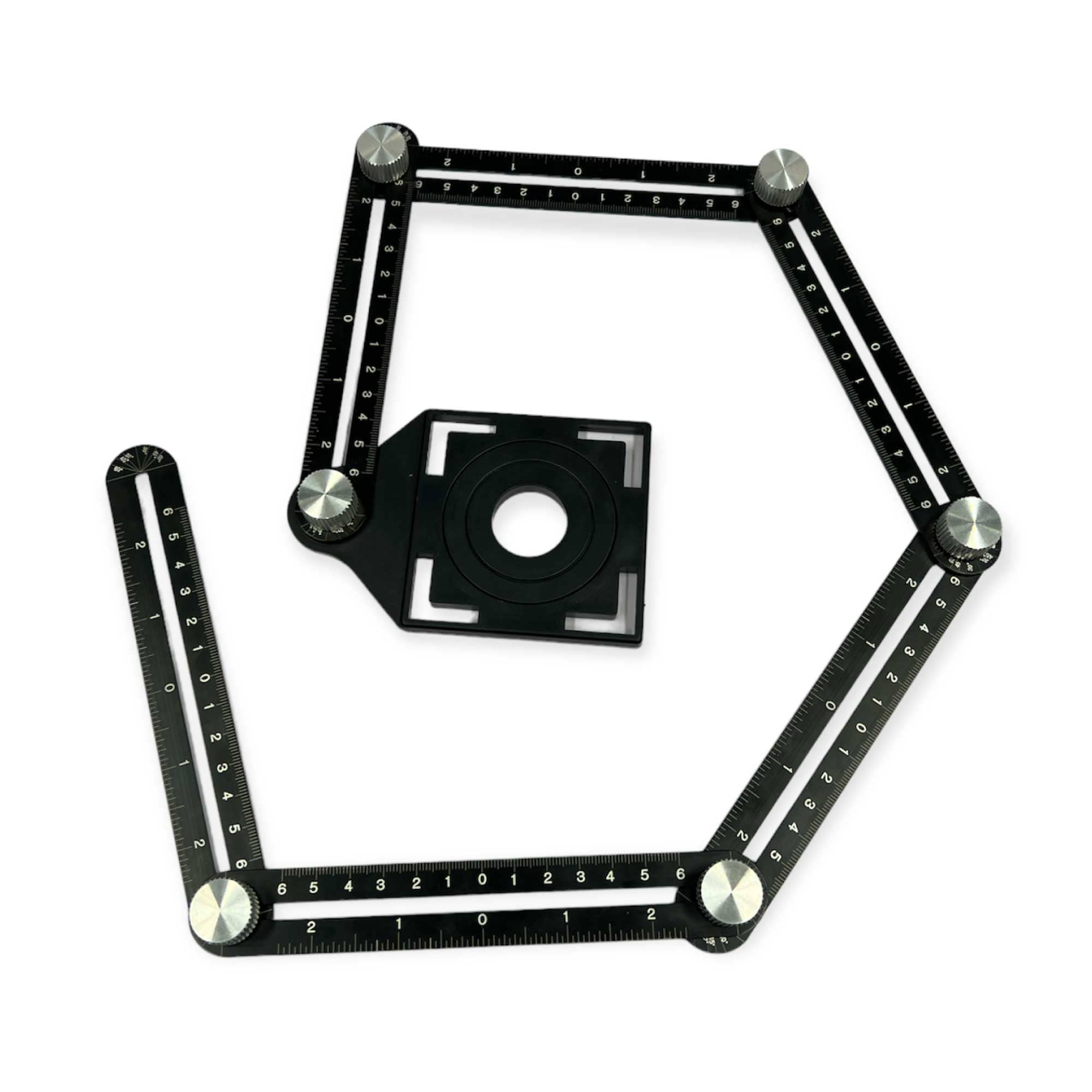 This 6 segmented foldable alloy angle ruler is the perfect tool for anybody in the professional trade or a casual DIYist. Consists of 6 seperate 12cm or 5" rulers and a very handy hole positioning template. Metal knobs allow for constant adjustment of the length or angles of the ruling components so it can conform to any space with ease.
