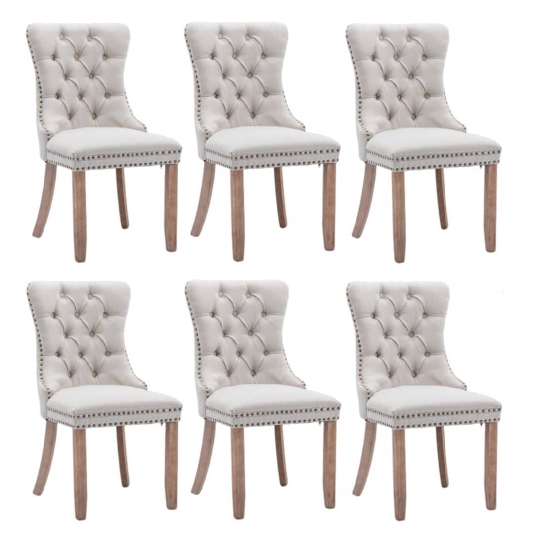6x AADEN Modern Elegant Button-Tufted Upholstered Linen Fabric with Studs Trim and Wooden legs Dining Side Chair-Beige