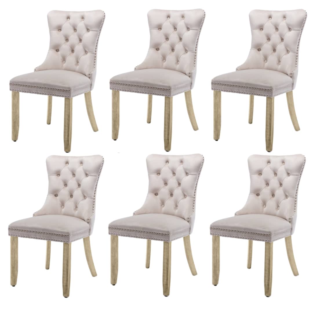 6x Velvet Dining Chairs Upholstered Tufted Kithcen Chair with Solid Wood Legs Stud Trim and Ring-Beige