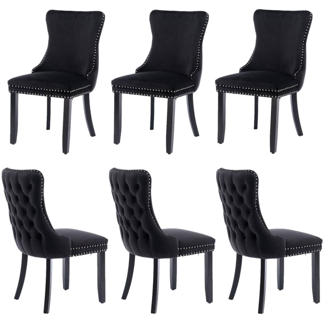 6x Velvet Upholstered Dining Chairs Tufted Wingback Side Chair with Studs Trim Solid Wood Legs for Kitchen