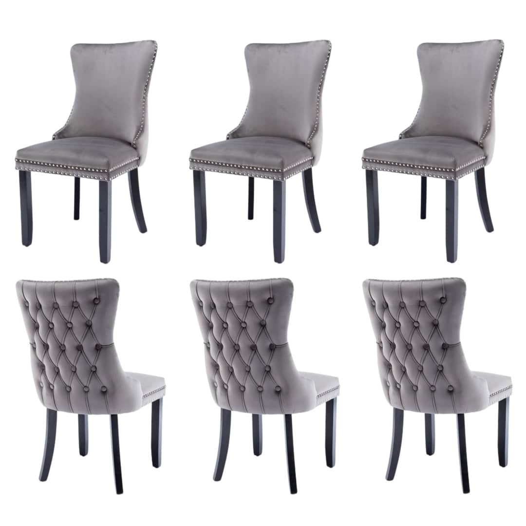 6x Velvet Upholstered Dining Chairs Tufted Wingback Side Chair with Studs Trim Solid Wood Legs for Kitchen