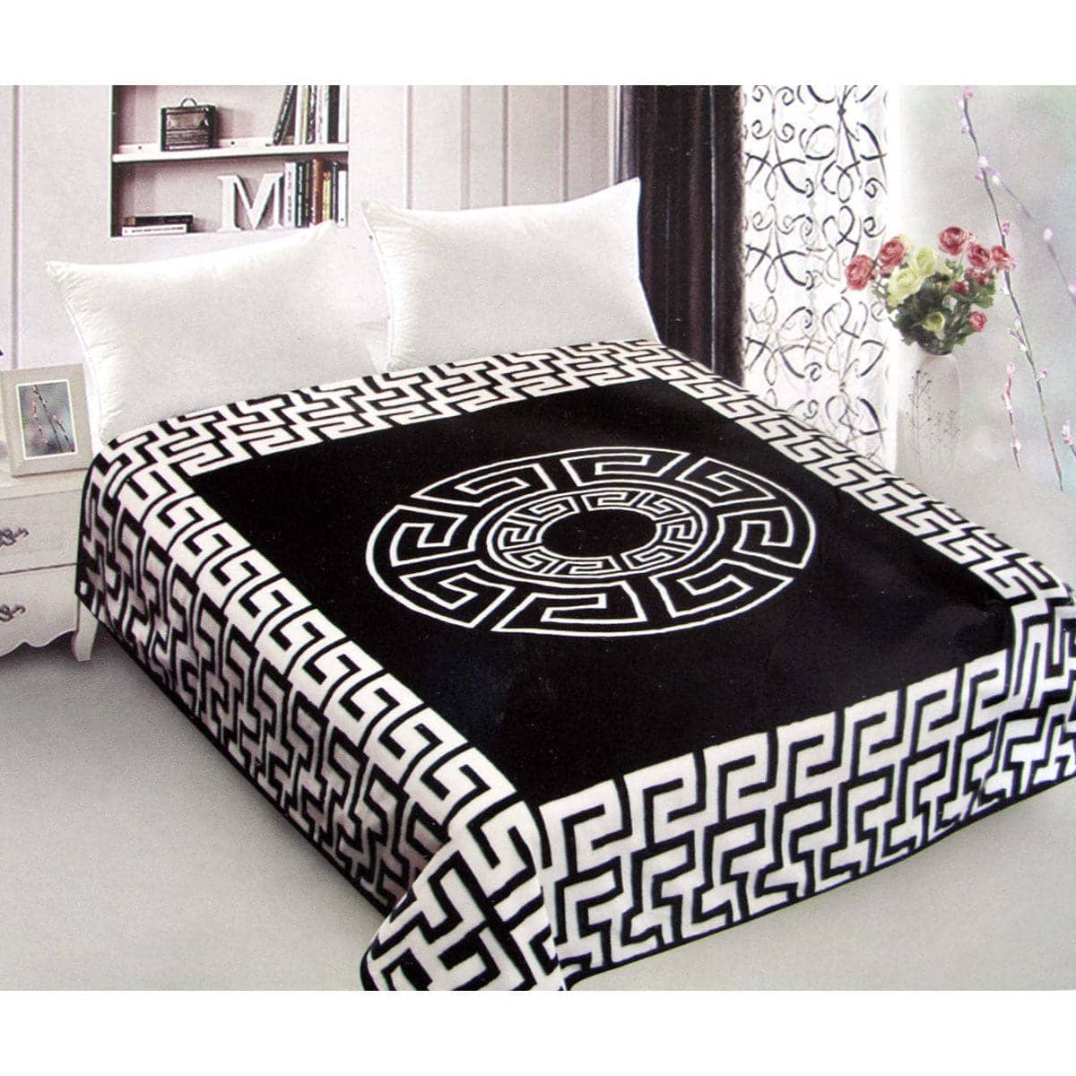 800GSM Luxury Reversible Mink Blanket Greek Key Black Queen 200 x 240 cm
