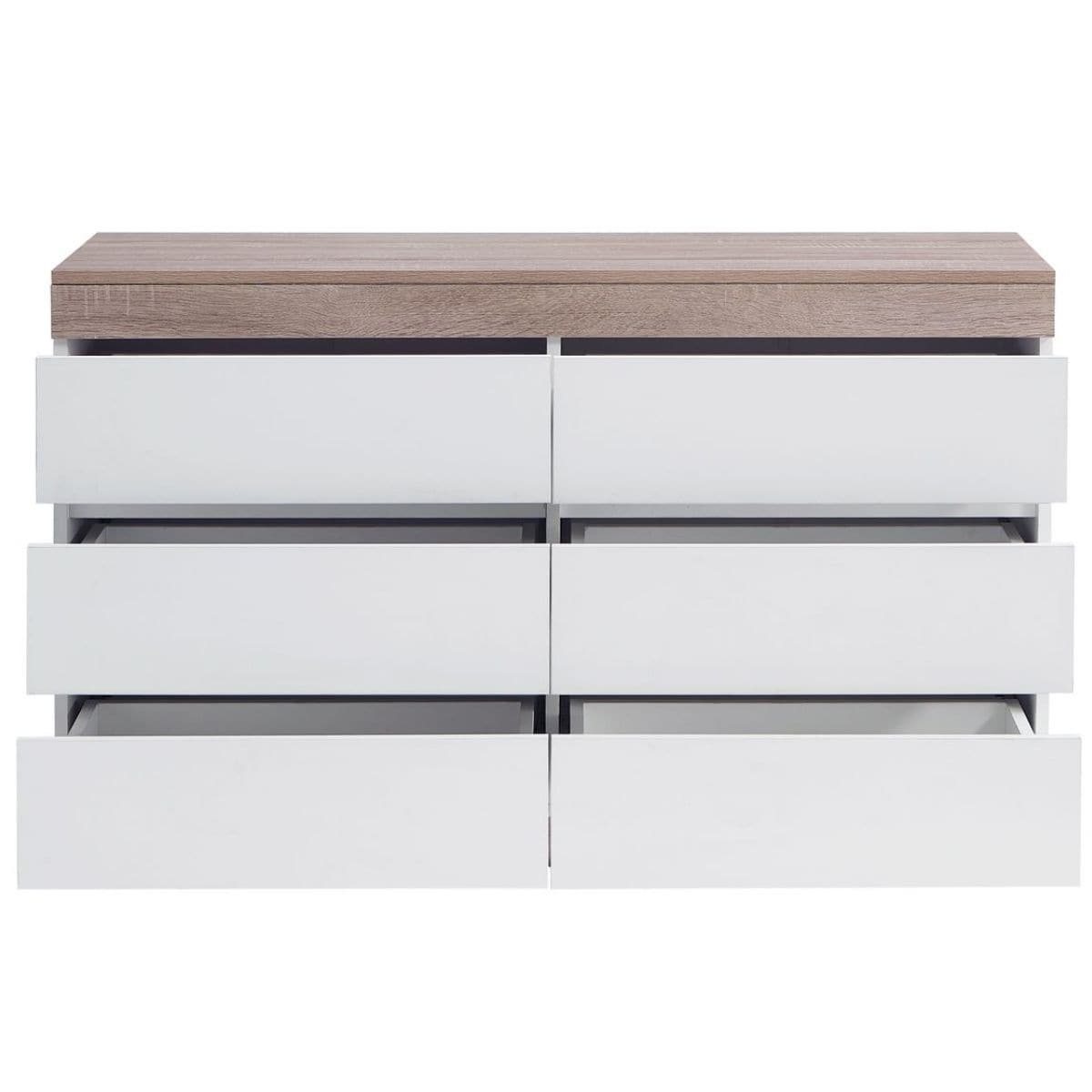 Featuring a classic wood-and-white theme, this chest of drawers is perfect for emulating a sense of bright cheer within your spaces.