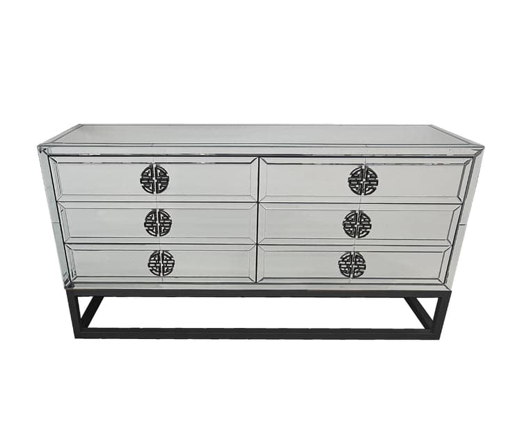 Looking for a luxurious and glamorous addition to your home decor? Look no further than the Athens Mirrored Dresser Table! This beautiful piece is crafted with clean lines and elegant antique brass Greek key handles, and it's sure to add a touch of glamour to any room. The beveled mirror surface is perfect for reflecting light and adding a sense of space to your room, and the six drawers provide plenty of storage space for all your essentials. Available in black, the Athens Mirrored Dresser Table is an ideal way to add a touch of luxury to your home.