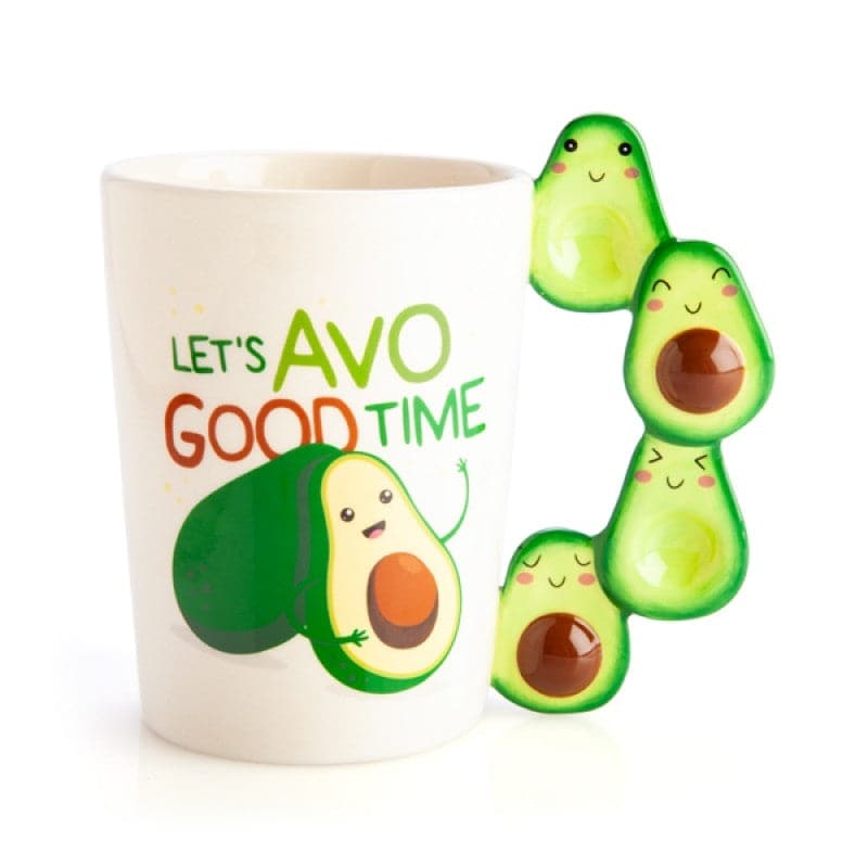 Ceramic mug with dynamic 3D handle made of smiling avocados