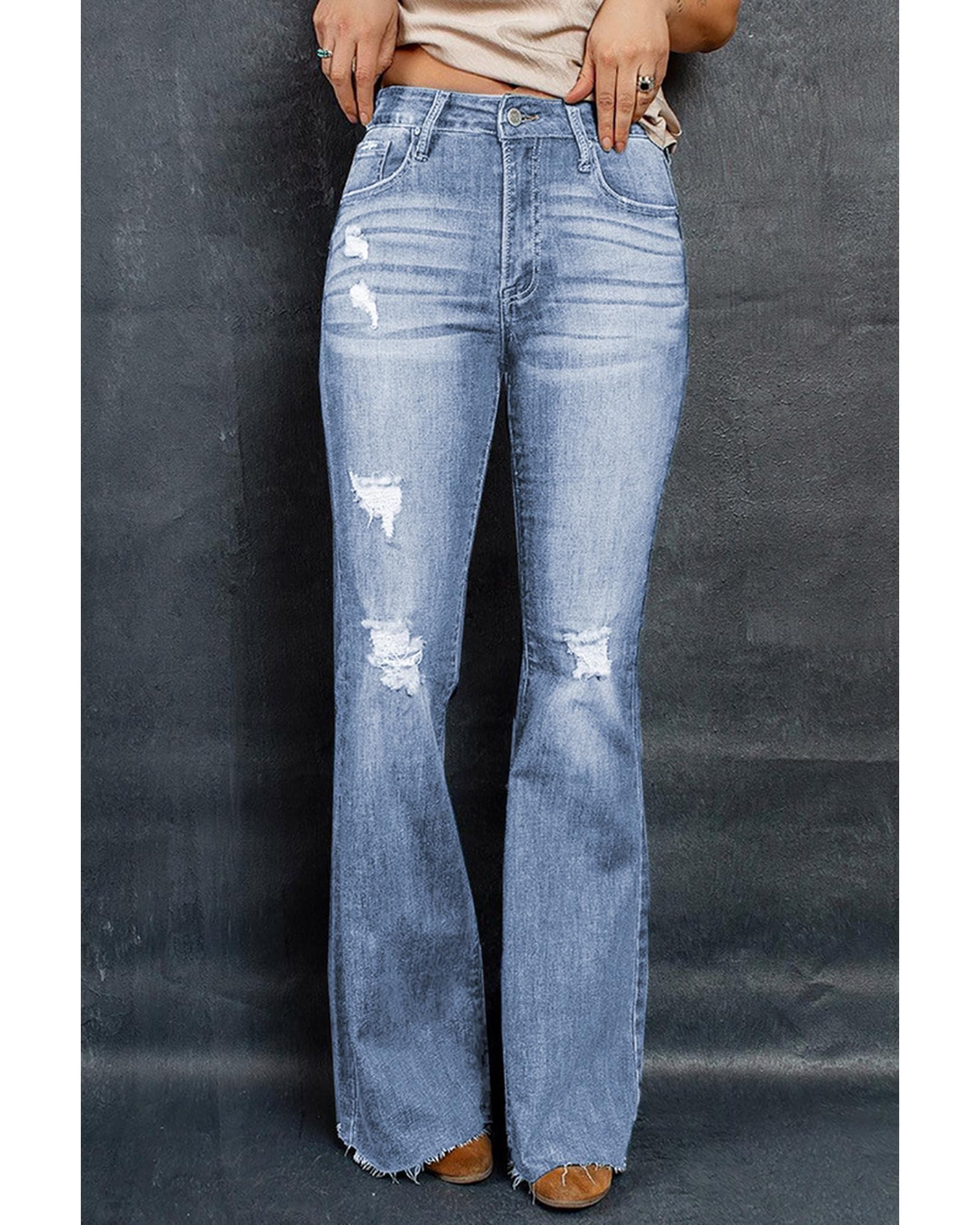 - Dark wash mid rise flare jeans
