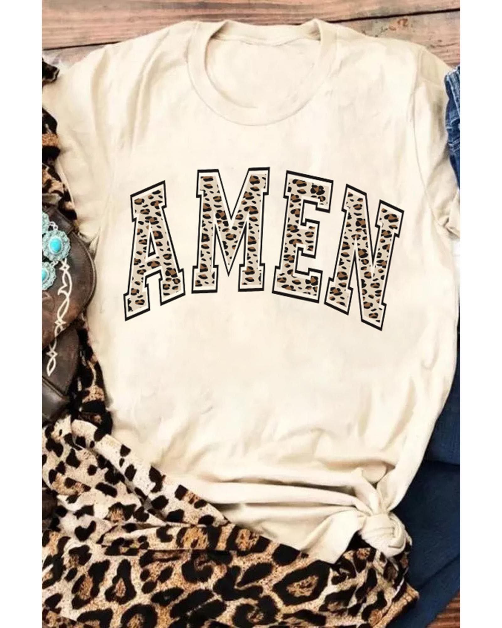 - Khaki AMEN leopard print short sleeve graphic t-shirt