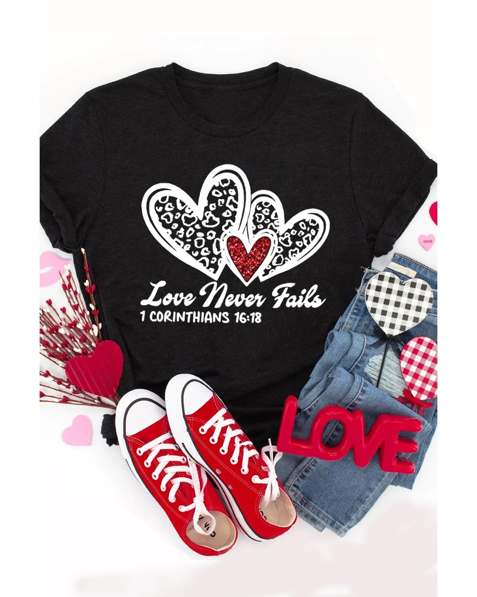 - Love Never Fails Leopard Sequin Heart Graphic Valentines Tee