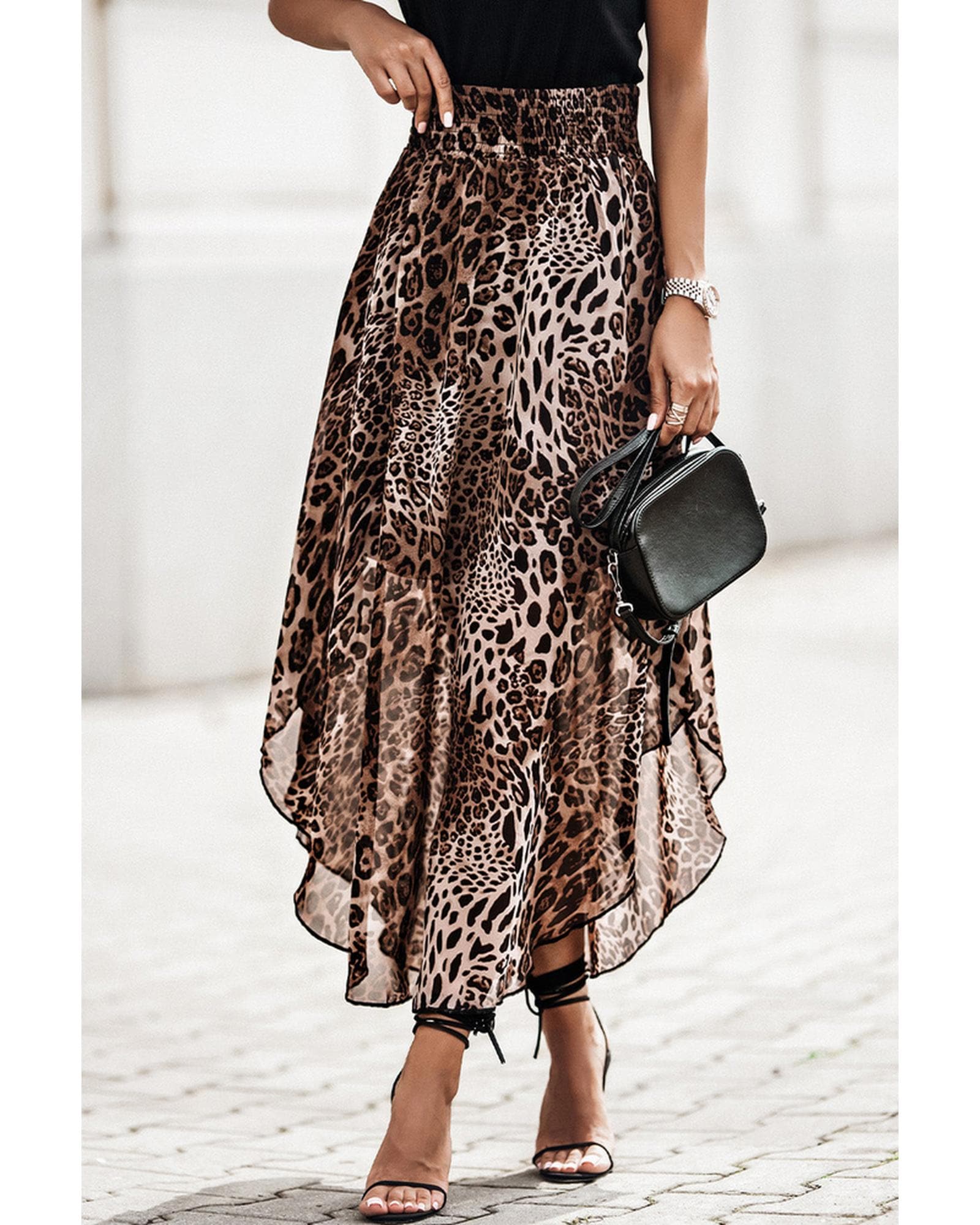 - Stylish Smocked Waist Leopard Skirt