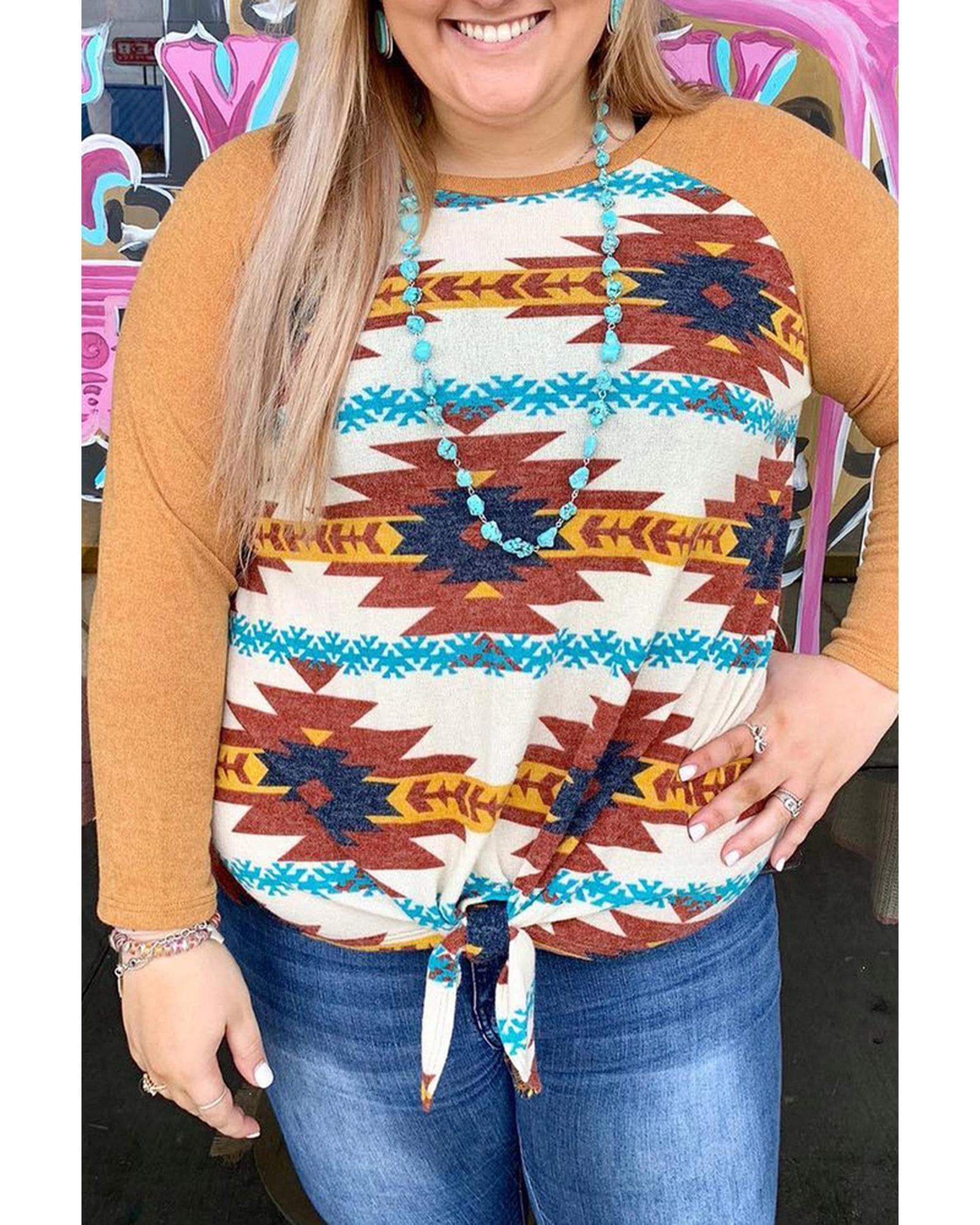 Azura Exchange Orange Aztec Print Raglan Long Sleeve Top - 4X