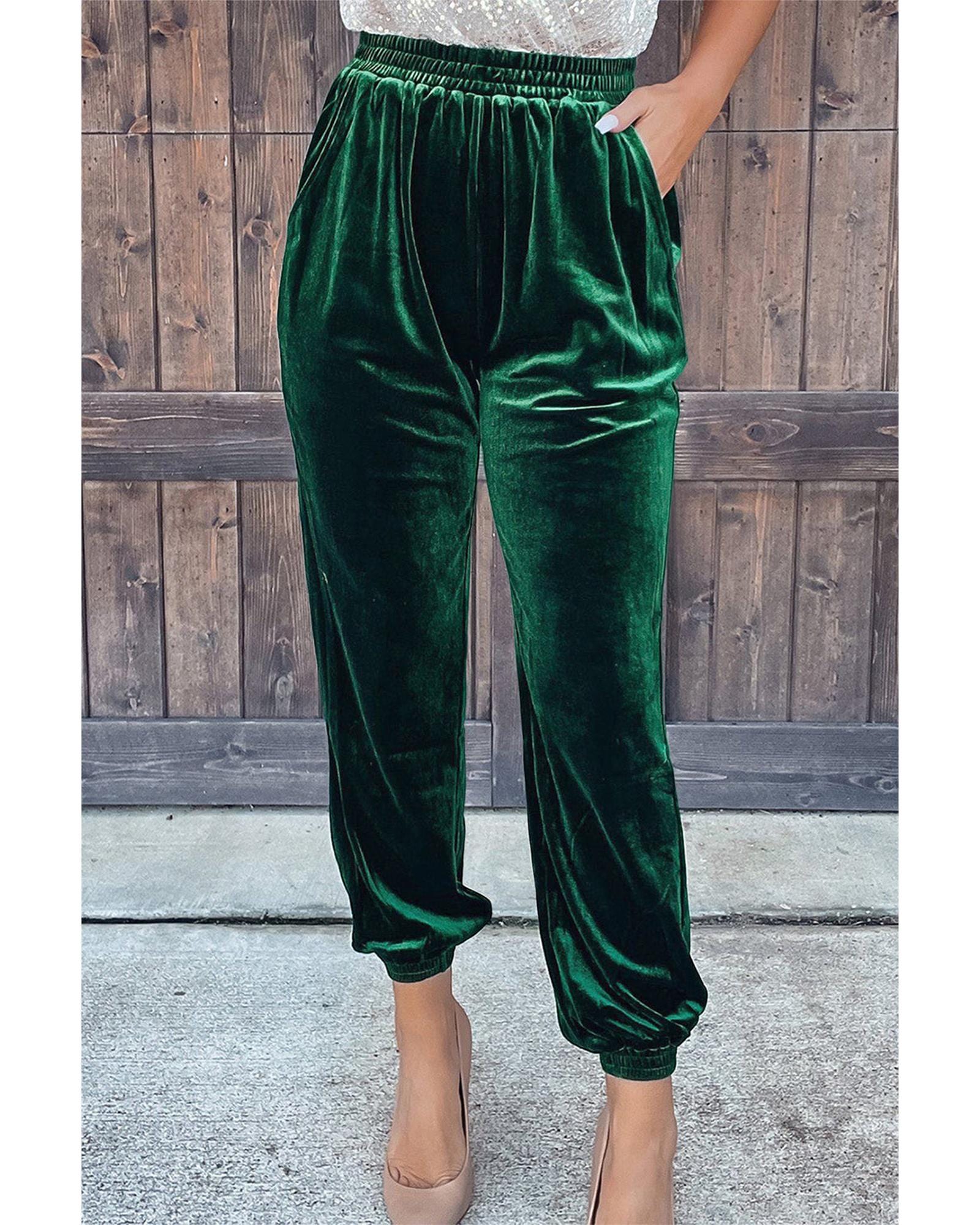 - Luxurious Green Solid Velvet Jogger Pants for women