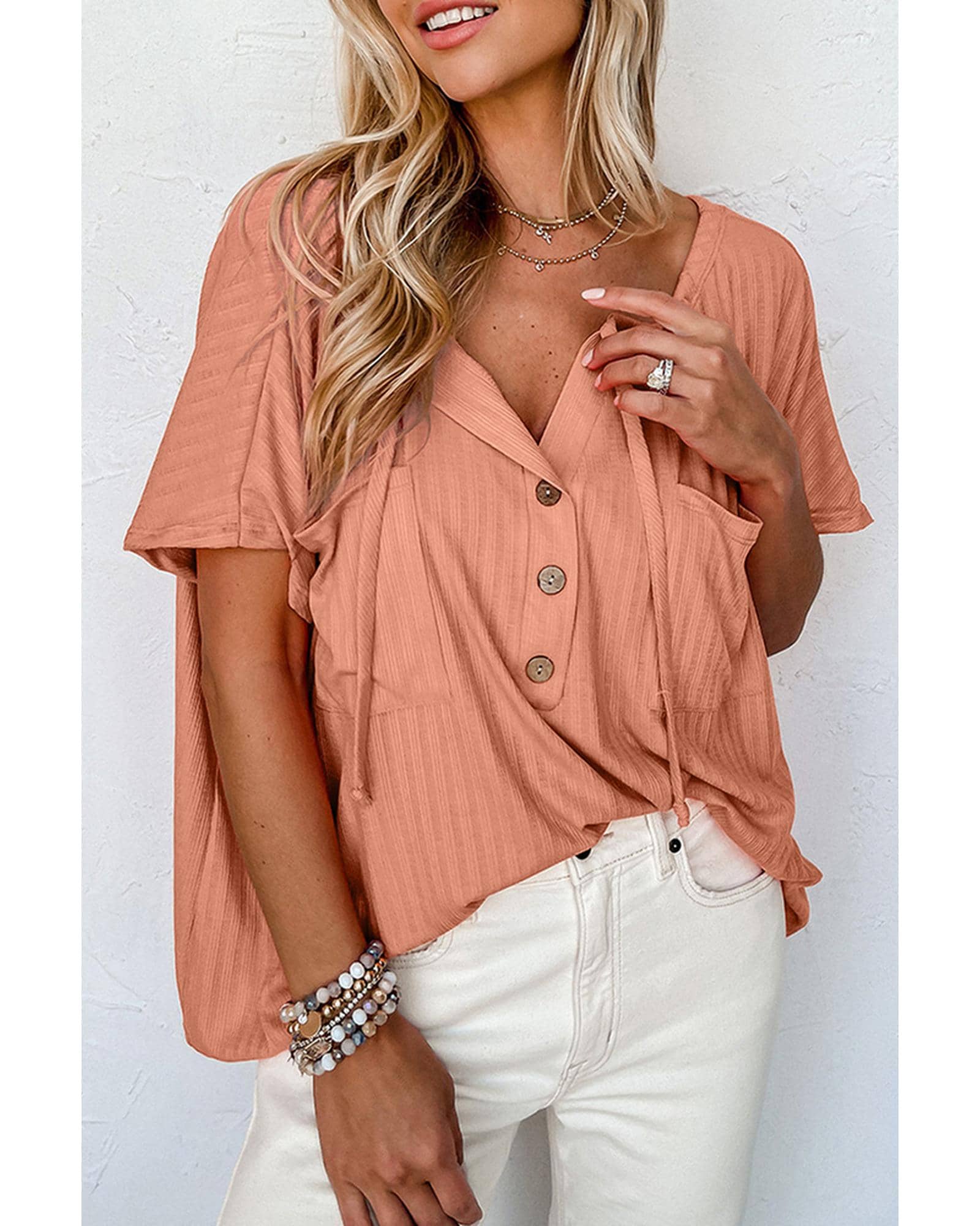- Stylish and versatile Notched V Neck Buttoned Front Textured Loose Top