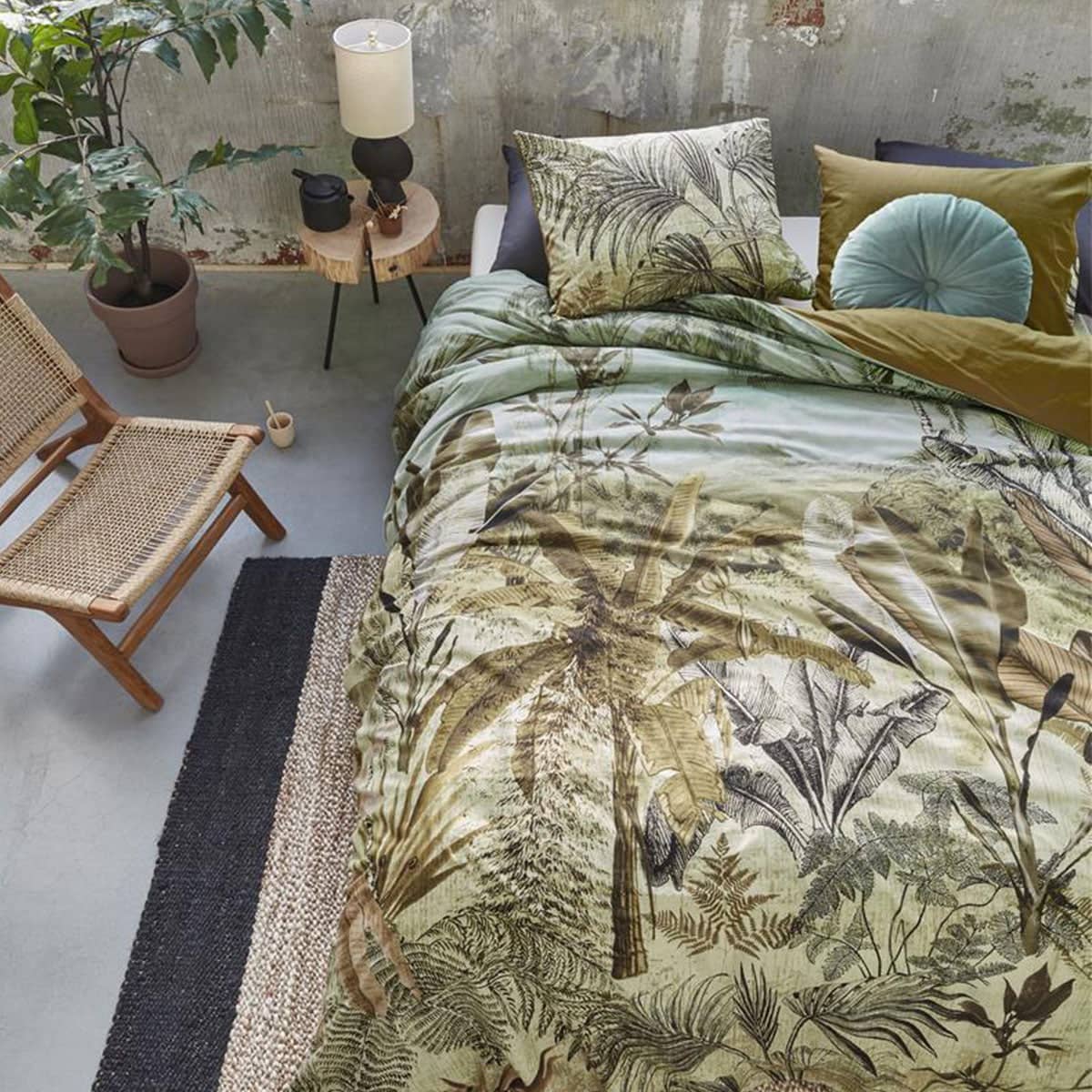 The Banda Green Cotton Quilt Cover Set by Bedding House fits in perfectly with today's botanical trend. The front of the quilt cover features an exotic landscape with banana leaves and palm trees printed in natural, taupe, green, brown, grey, and frost colour tones on a calm background. The back of the quilt cover is olive green.