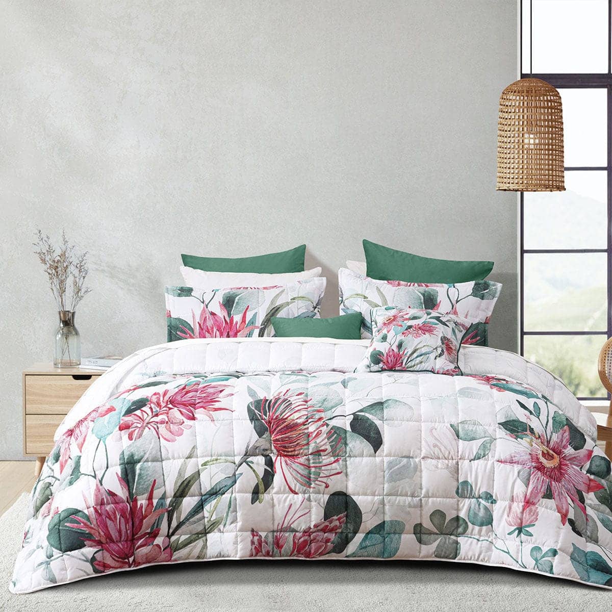 Delightful, blossoming proteas contrast beautifully against the on trend neutral white, pink, green, grey, dark green, and burgundy tones of the leaves which spread across the entire coverlet set. Panel printed on soft quilted fabric, the Nikita coverlet will brighten up your space.