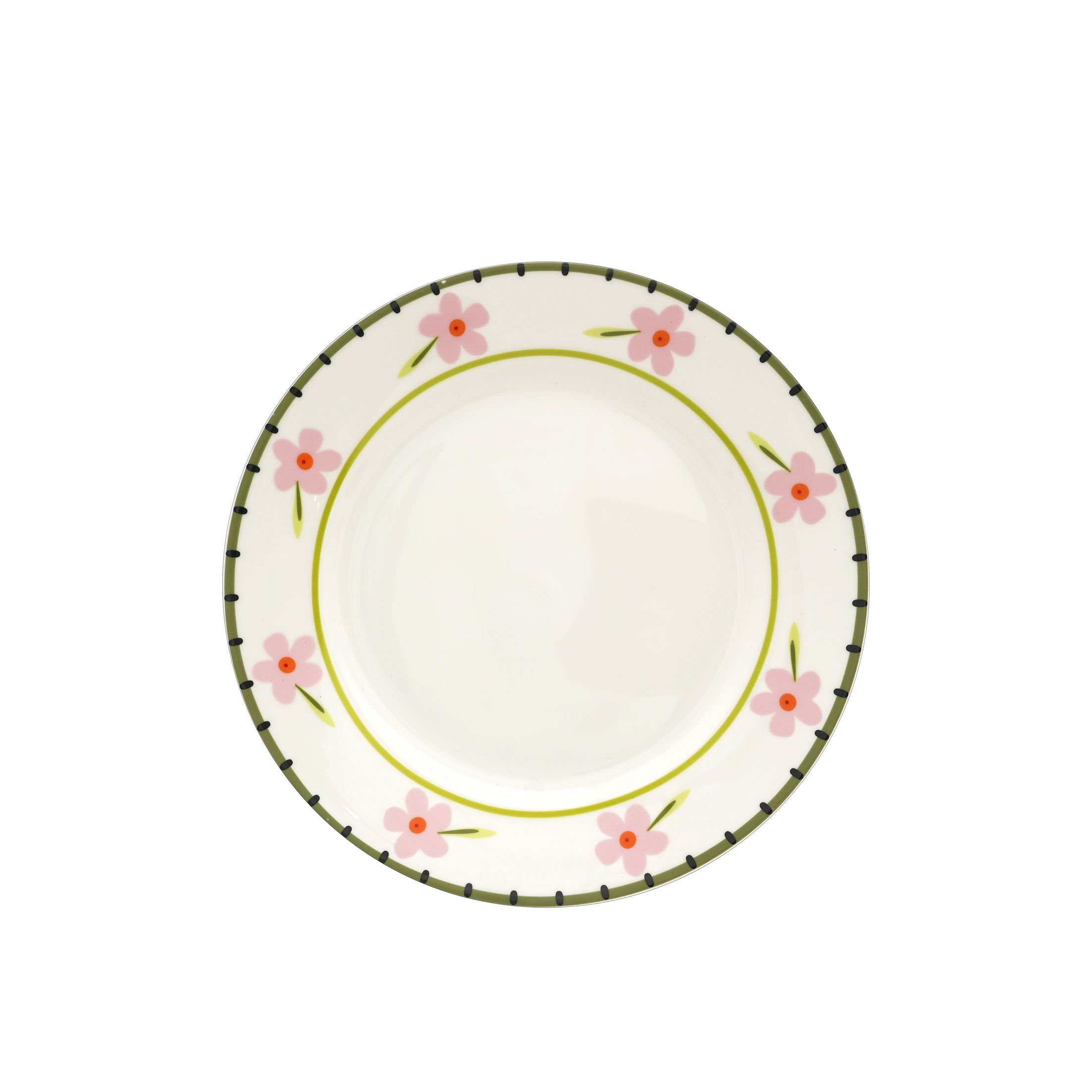 This Bouquet Flat Plate features pink flower motif against a white fine porcelain background. The plates are adorned with hand-painted elegant border in grey and black, elevating its refined style.