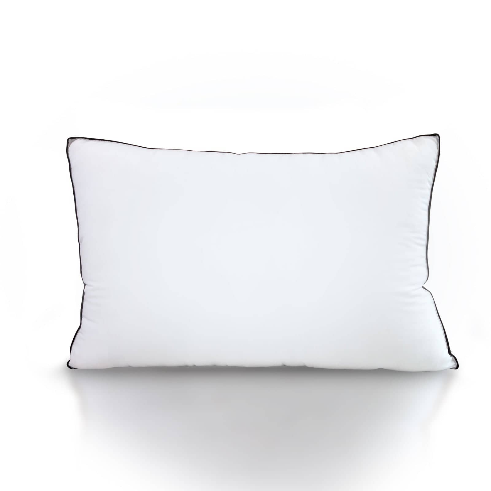 With a medium profile, this pillow features black piping for an added element to design and is encased in a 100% cotton cover.