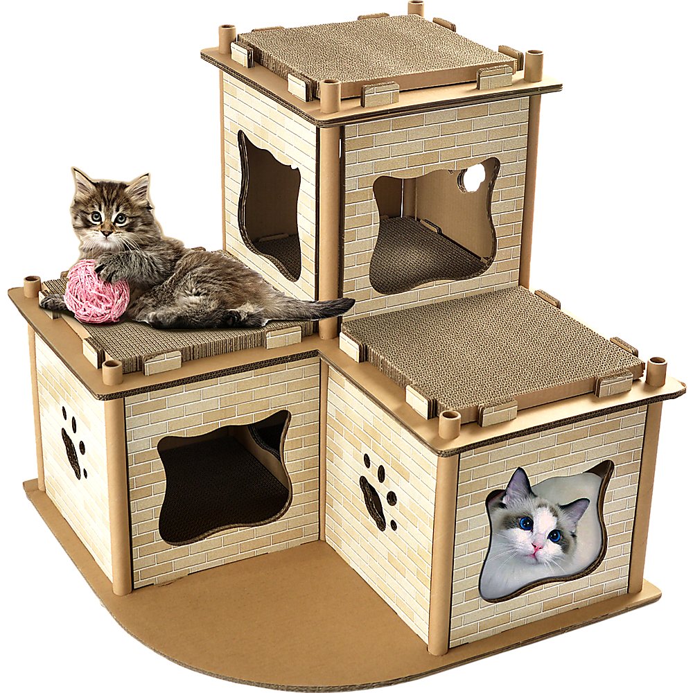 Whether your cat prefers to lounge around on the roof or hiding in wait for a mouse to happen by on the first floor, she'll have a sturdy, lightweight spot to chill out. Multiple scratchboards let her sharpen her claws in style. With these scratchboards, she'll never have to use your furniture as her nail sharpener. An adorable cat face-shaped entrance door makes sure everyone knows just whose home this is. Pamper your kitty with a house of her own. Order your cat condo today!
