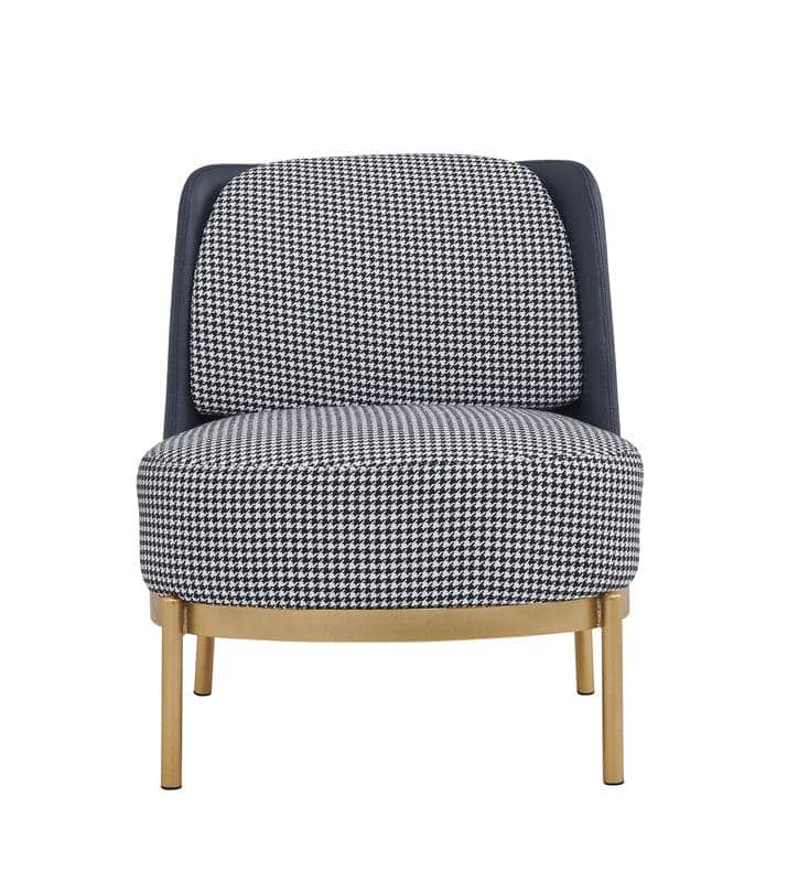 Description This cocktail chair is upholstered with houndstooth pattern fabric on the front with navy PU back. Not Included: Ottoman Toss Pillows Features The rounded seat is supported by a golden colour powder-coated iron base Other Dimensions Overall 82cm H X 62cm W X 59cm D Seat 43cm H X 62cm W X 48cm D Back Dimensions 43cm H Overall Product Weight 18kgFeatures Chair Design Slipper Chair Back Type Fixed Back; Fixed Back Swivel No Upholstery Colour Black; White Upholstered Yes Pattern Houndstooth Upholstery Material Faux Leather; Chenille Upholstery Material Texture Chenille Frame Material Solid Wood Fill Material Foam Back Fill Material Foam Seat Construction MDF Leg Material Metal Nailhead Trim Yes Weight Capacity 120kg Accent Pillow Included No Number of Chairs Included 1 Removable Cushions Yes Removable Cushion Cover No Leg Material Details Powder coated Product Care Wipe clean with a dry cloth, Do not use chemical cleaners. Specifications BS 5852 Certified Yes Assembly Assembly Required Yes Suggested Number of People for Assembly/Install 2 Warranty Manufacturer Warranty Yes Warranty Length 1 Year Full or Limited Warranty Limited