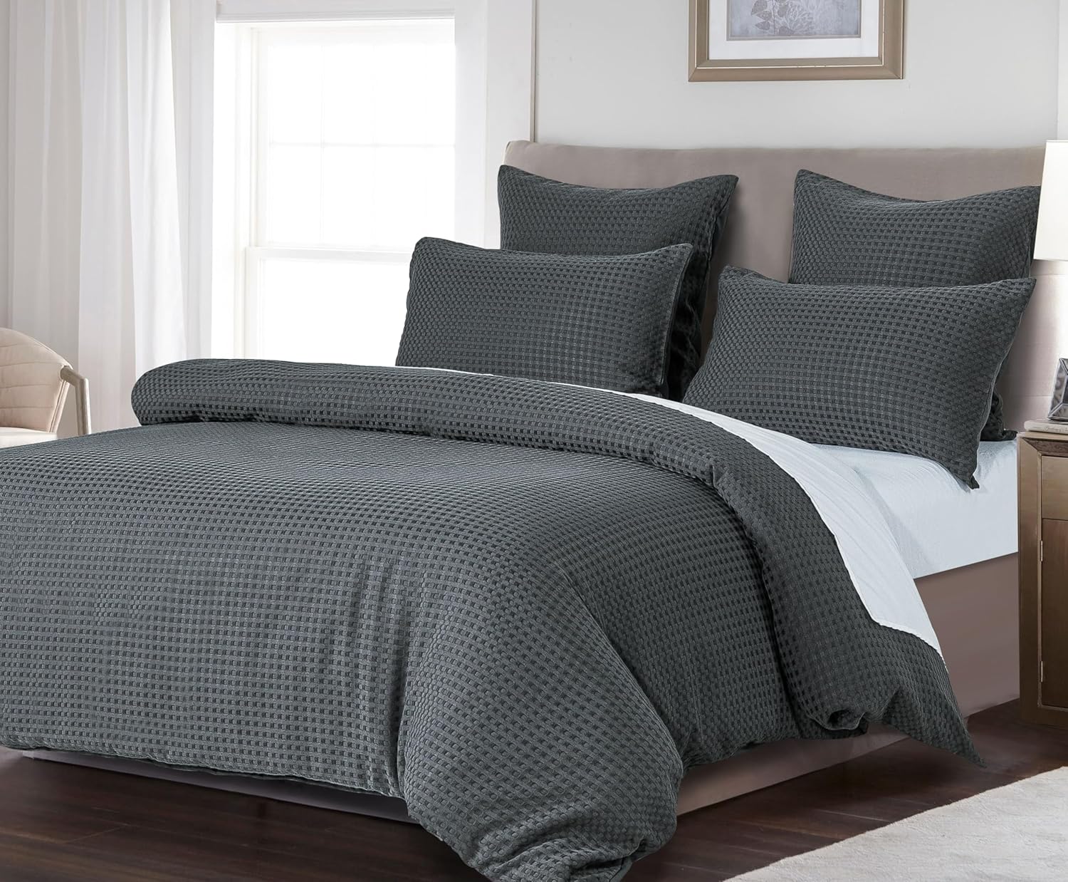 CleverPolly 100% Premium Waffle Microfibre Quilt Cover Set (3Pcs) - Dark Grey - Double