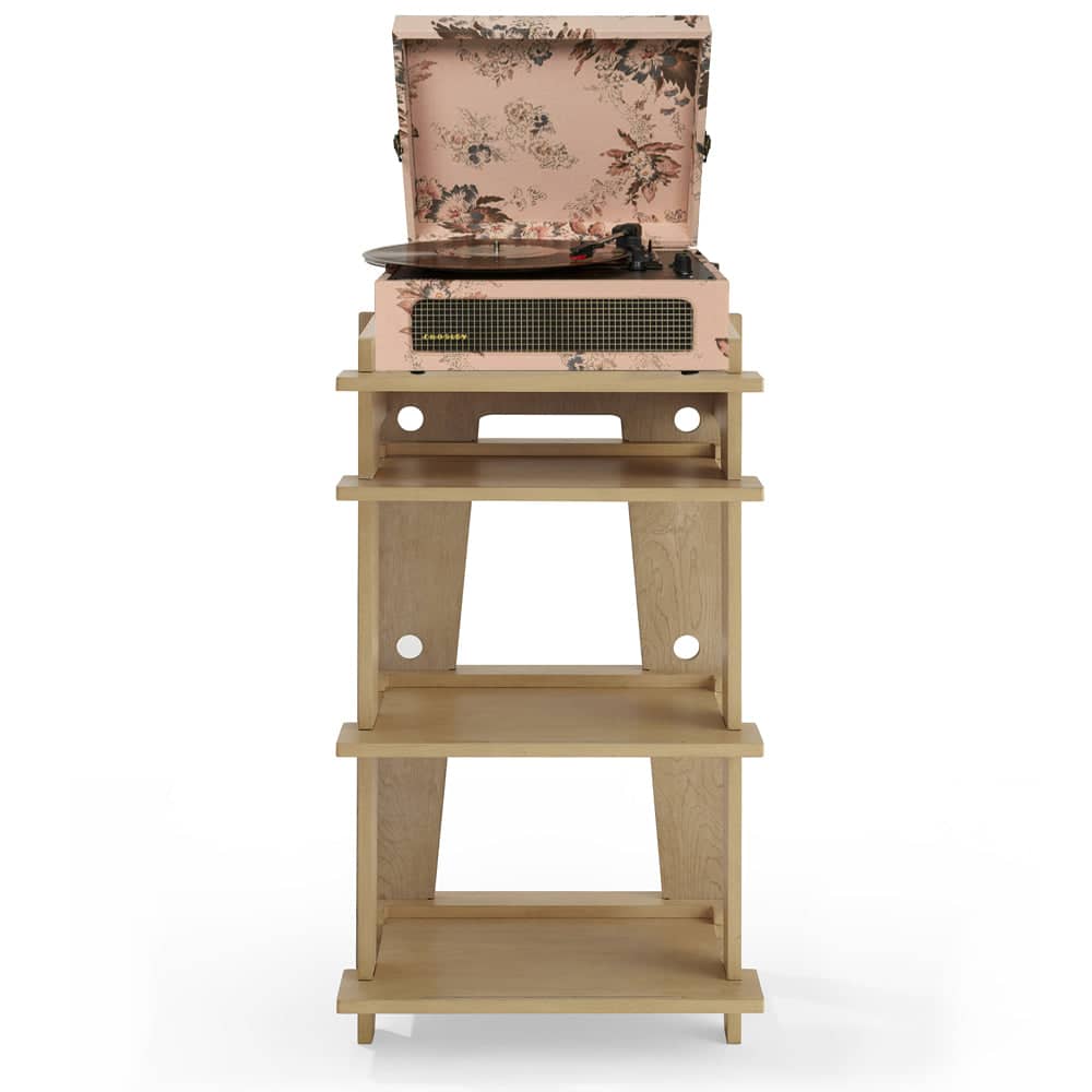 The Soho by Crosley is the music lover's ultimate turntable stand. The top shelf fits most component-style turntables and features two cable management holes to keep your setup tidy. The bottom two shelves can hold up to 100 records each and feature bumpers in the back to ensure that the records sit uniform and are easily accessible.