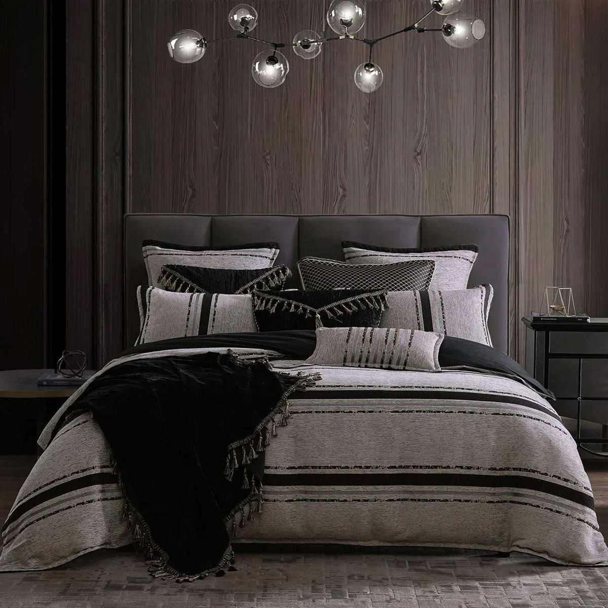 Gambusi Smoke Chenille Jacquard Quilt Cover Set by Davinci is contemporary luxe. Soft and tactile chenille works with a medley of stripes in tonal metallics of smoke, black, and grey to form a smart, geometric story. Self-flanged edges are boldly defined with twisted rope cord in black.