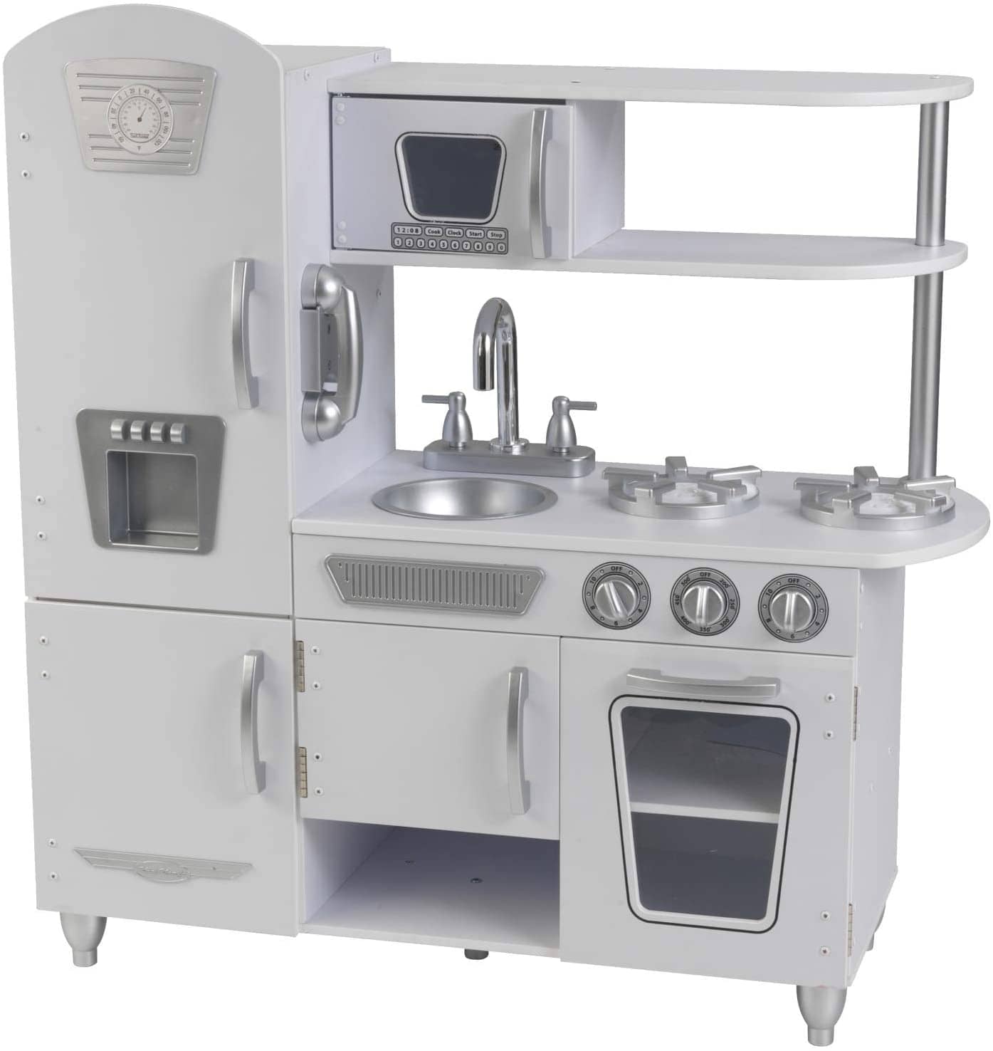 - Bon Apptit. Our Vintage Kitchen in White lets kids pretend they are cooking big feasts for the whole family. With its close attention to detail and interactive features, this adorable kitchen would make a great gift for any of the young chefs in your life. Doors open and close. Oven knobs click and turn. Cordless phone. Removable sink for easy cleanup.