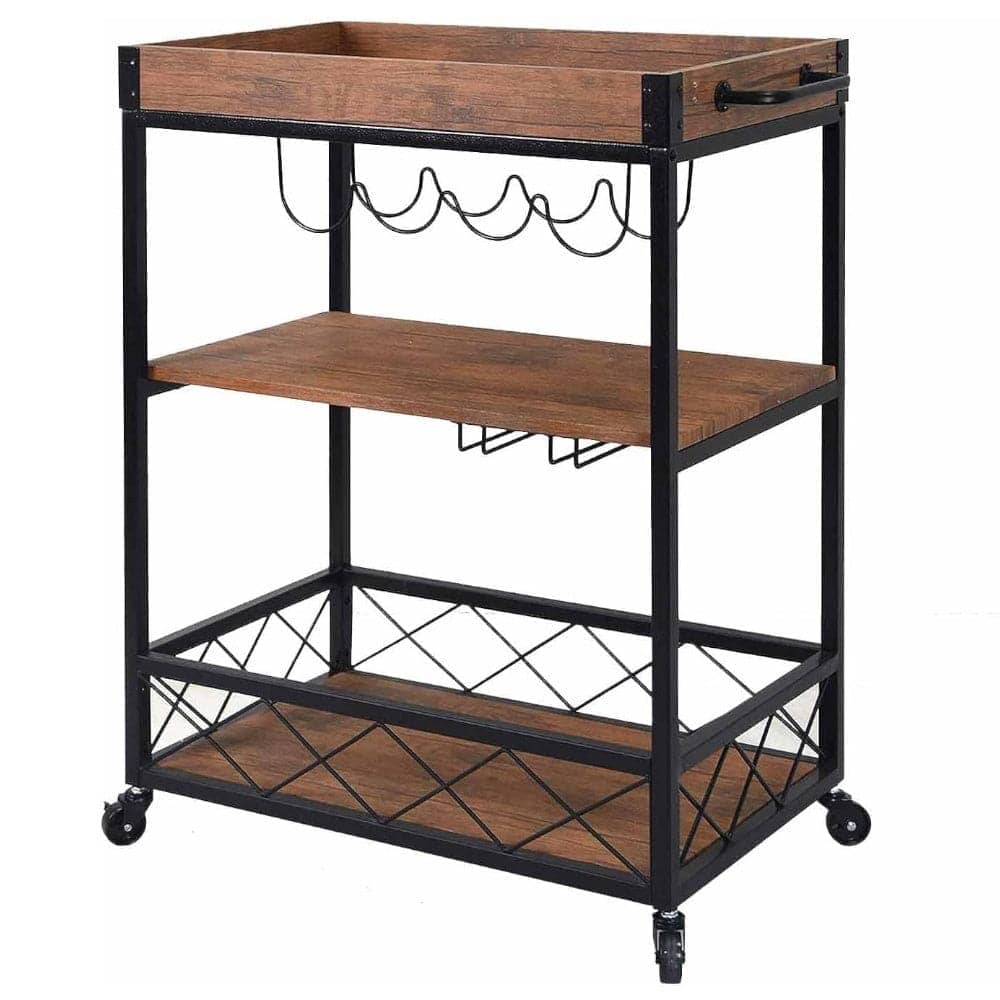EKKIO 3 Tiers Kitchen Serving Wine Cart Trolley with Wine Rack (Walnut)