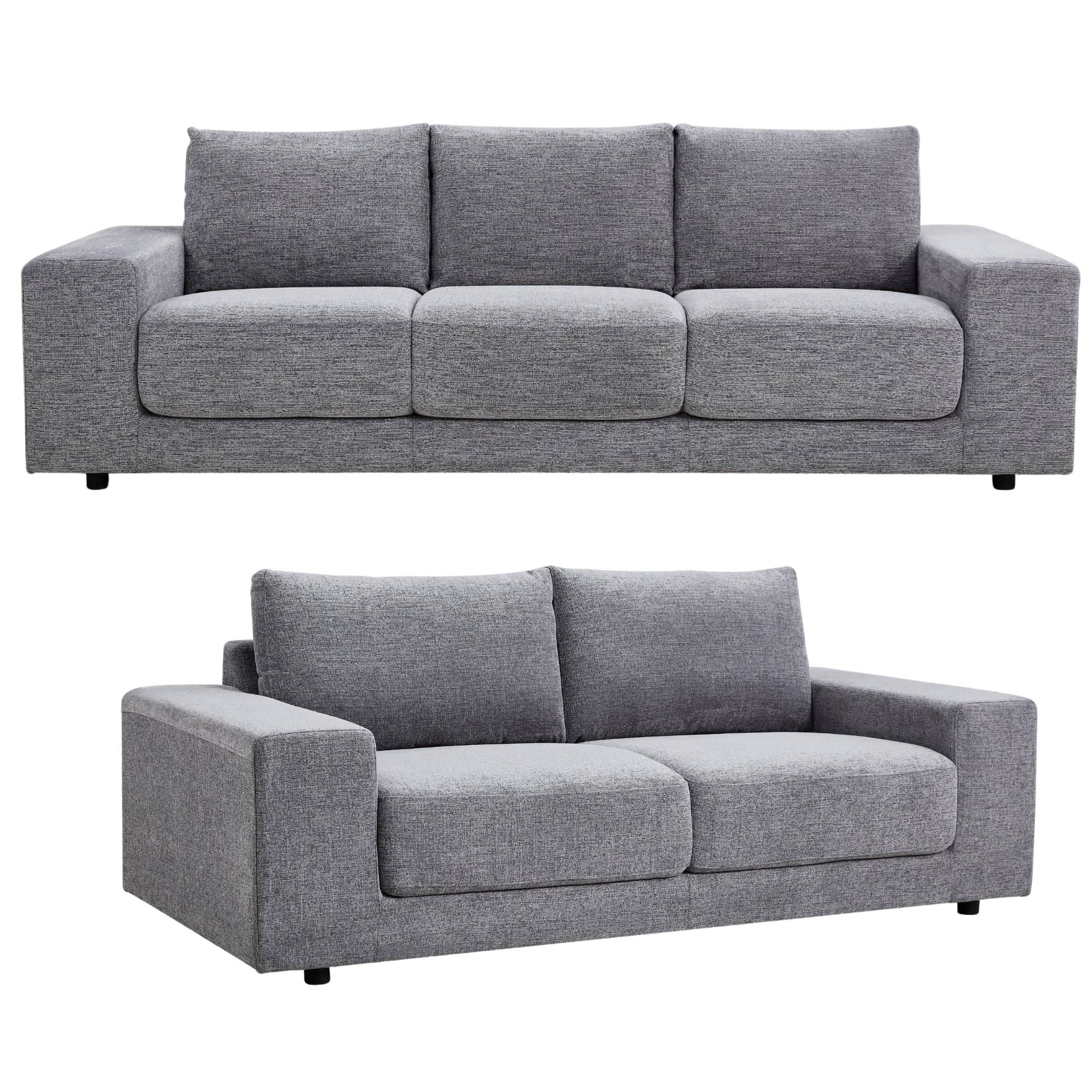 Here is a sofa set with generous seating space, showcasing the best of minimalist furniture styling. The sofa's square arm design, fixed seat, and reversible back cushions ensure the best comfort. The contemporary style, 4-seater and 3-seater sofas are upholstered in Hampton fabric, a plush upholstery made of high-performance 100% polyester. The upholstery has a consistent fit and finish due to the perfect tailoring on the precision jig-cut steel frames. The durable Galvanised steel frame with seating support made of HD PU foam, polyester fibre, fabric, and a high tensile spring ensures great strength for the sofa.The steel frame can withstand a weight of up to 300 kg. The precision-cut steel frame keeps the sofa light and exceptionally durable; up to five times stronger and weighs half when compared to traditional sofa frames. Furthermore, 4 layers of seat cushioning with premium HD edge support provide excellent back and lumbar support. Steel, black powder-coated legs enhance the look of the sofa. The steel-core legs are directly bolted to the steel frame. So, relax, because there are no more broken or damaged legs. The sofa is easy-to assemble; only the legs need assembly. The sofa comes with a one-year warranty.