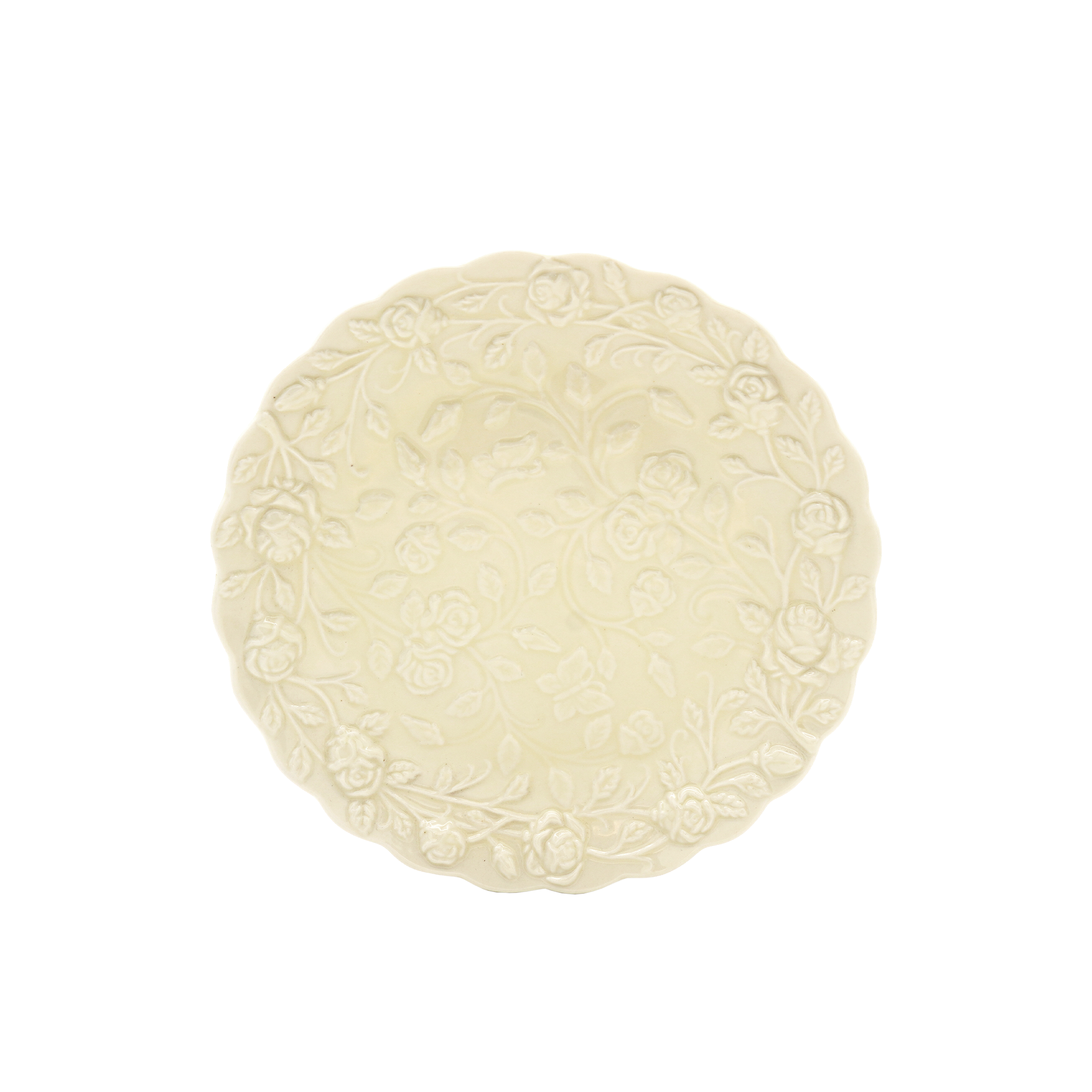 Striking in its delicacy, this Faubourg Embossed Flat Plate is crafted of high-quality ceramic. The embossed pattern of rose with leaf enhances the rim while complementing the sophistication of the flowers that grace spots of the plates' edge and their center section.