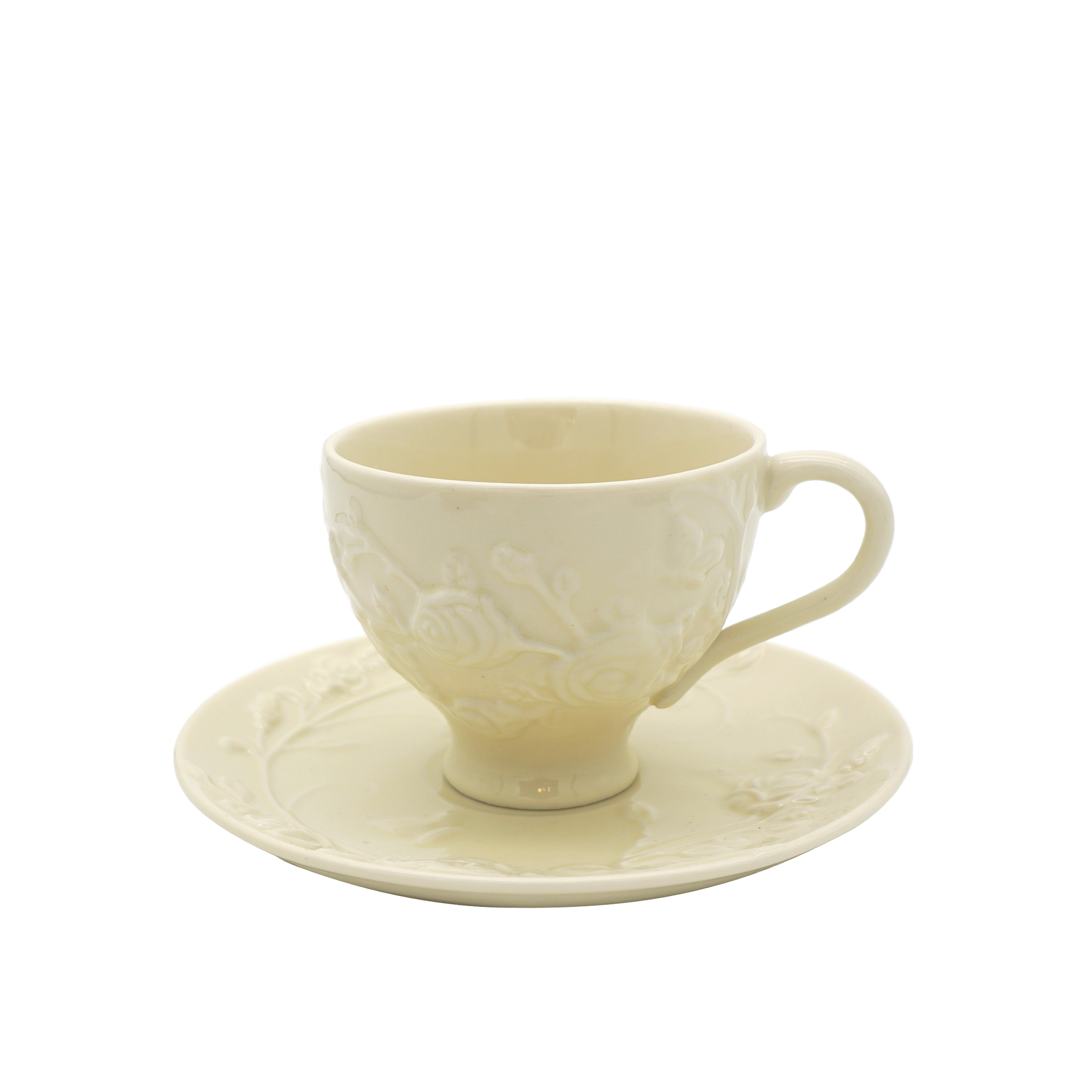 Crafted from high-quality ceramic, the Faubourg Rose embossed Tea Cup and Saucer, is adorned with a rose decorative surface and a refined hues of white and grey. Enjoy an after-dinner coffee or tea with guests from these elegant cups.