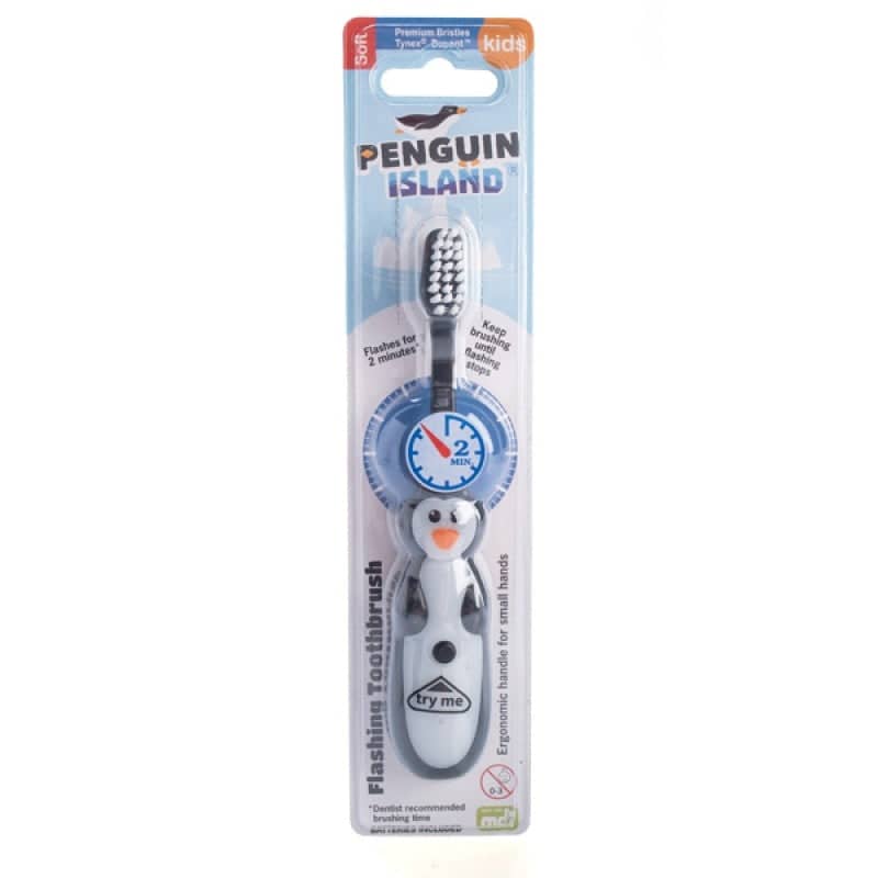 Cute penguin shaped toothbrush with flashing light – light flashes for the recommended brushing time of 2 minutes
