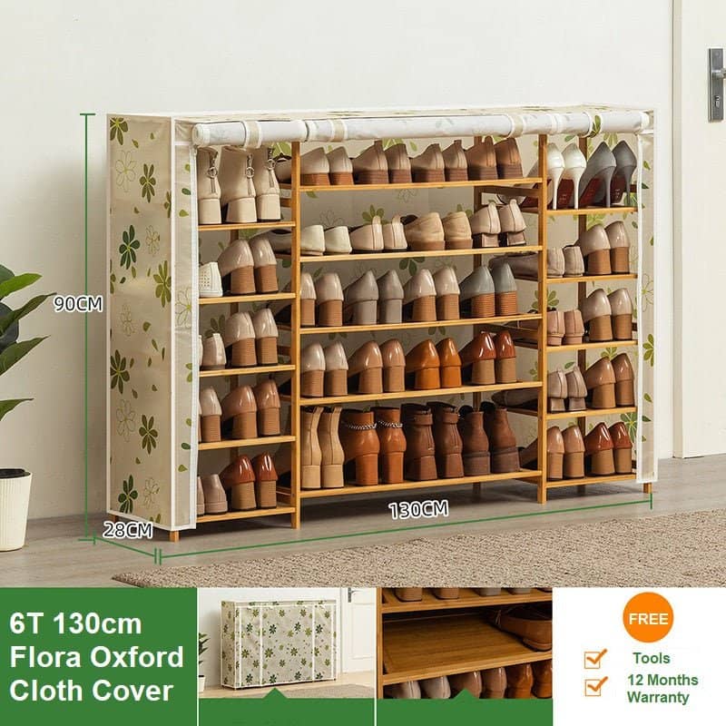 Flora Cover Six Tier Oxford Cloth Covered Tower Bamboo Wooden Shoe Rack Boot Shelf Stand Storage Organizer