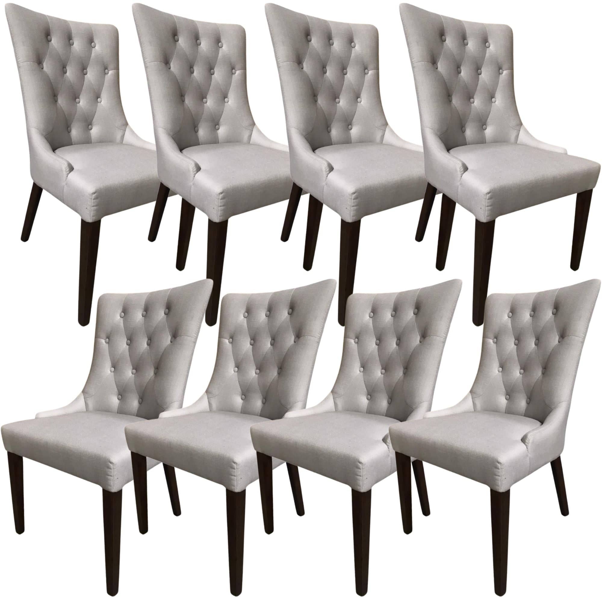 The journey to a comfortable dining experience begins with this 8-piece set of dining chairs. Bring home this beautiful armless dining chair that promises both comfort and strength with its button-tufted seat, fabric upholstery, tapered legs, and a strong structural frame of sustainably harvested rubber wood. Decorate your dining area with this chair set in a light grey colour with antique walnut legs and enjoy the beauty of the dining area setting. The dining chairs are designed in the French Provincial style and provide comfortable back and lumbar support. Because of their gorgeous looks and designer stitching on the upholstery, they are a beautiful addition to your living area. And thanks to their homely shape, they look stunning in all decor settings and can be paired with a dining table of any style. A one-year warranty is included with the fully assembled dining chairs.