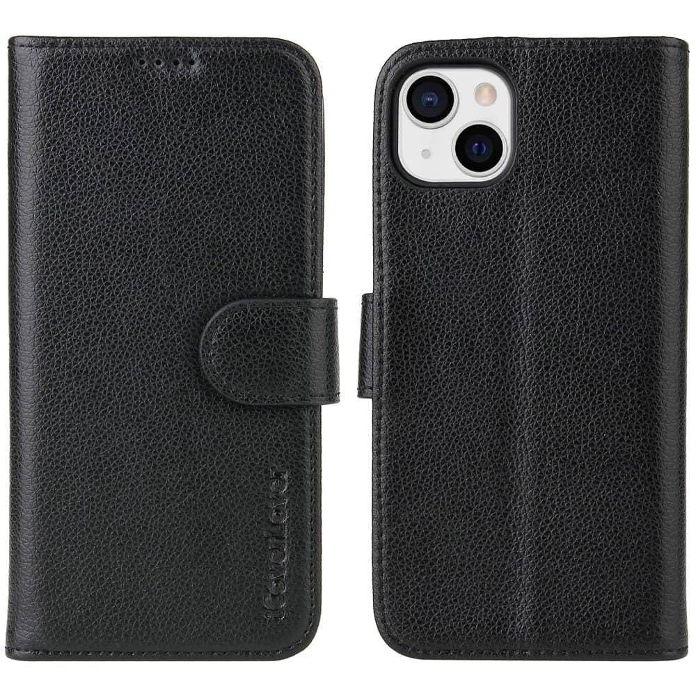 For iPhone 14 Plus Case iCoverLover Black Genuine Cow Leather Wallet Folio Cover