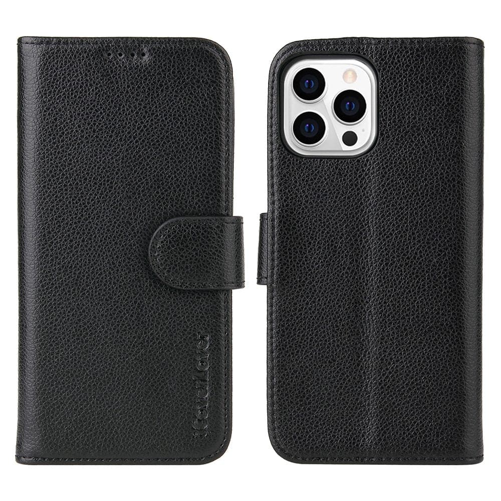 For iPhone 14 Pro Case iCoverLover Black Genuine Cow Leather Wallet Folio Cover