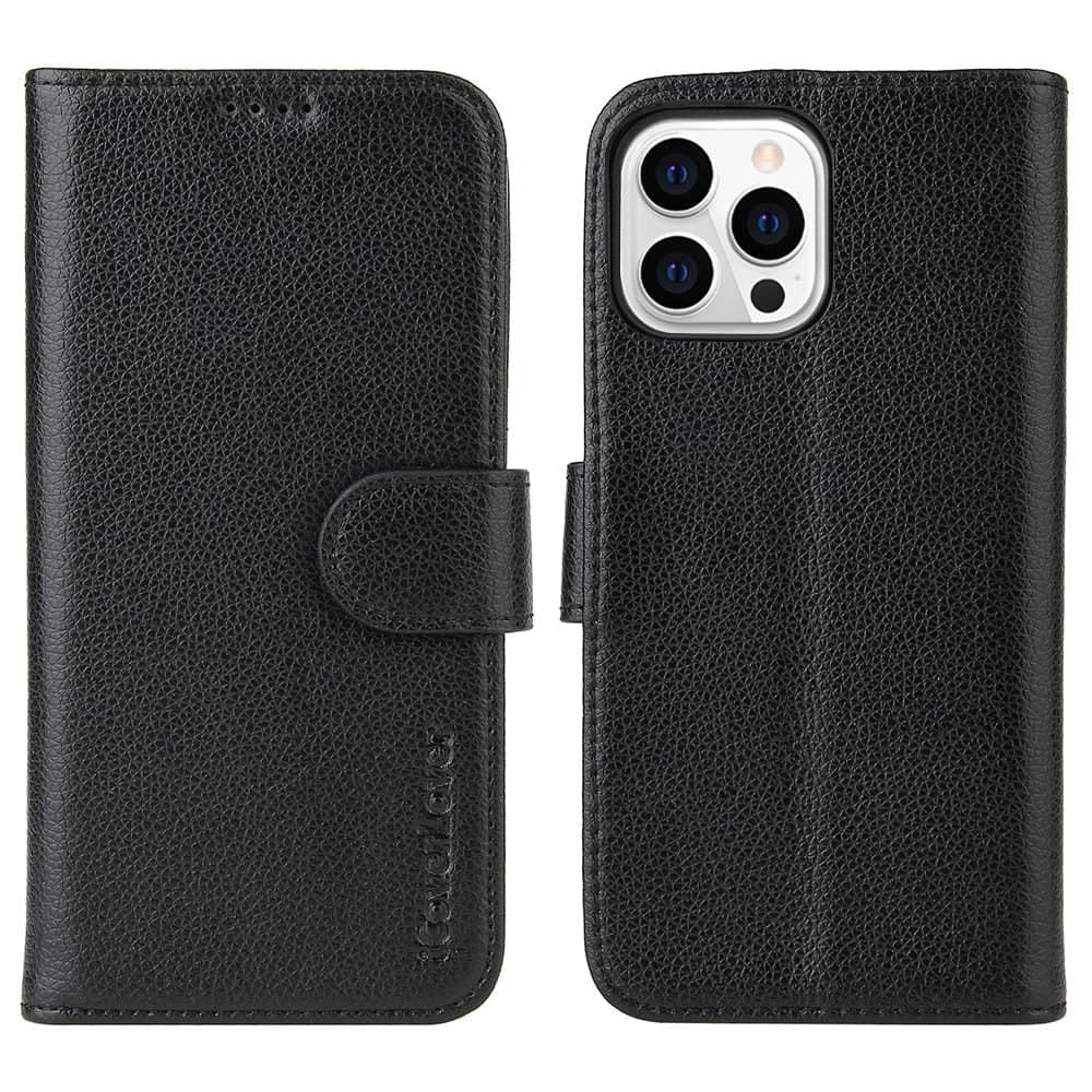 For iPhone 14 Pro Max Case iCoverLover Black Genuine Cow Leather Wallet Folio Cover