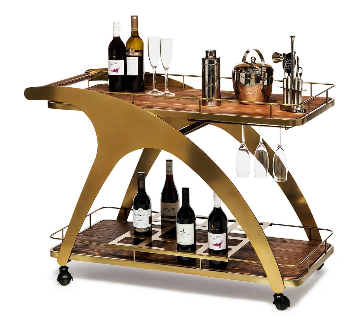 - Colour: Body: French Brass | Shelf Base: Walnut Finish | Wheels: Black