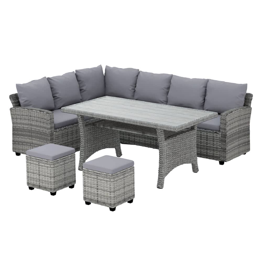 Looking to create a chic and gorgeous outdoor dining setting? The Gardeon 9-seater wicker outdoor dining set is a must purchase. It will liven up your outdoor space and help you achieve an elegant space where you can enjoy day and night and summer and winter. The set comprises of two three-seater sofas, a corner attachment, a large table and two ottomans. Its beautiful and versatile design makes it perfect for indoor and outdoor use. This outdoor set features a lovely wicker weave for a touch of tropical charm, and the UV-resistant PE wicker with weather-resistant steel frame is suitable for all-season use. Its customisable design allows you to style this outdoor dining set in multiple ways. The large wood plastic table boasting solid structure ensures strength and durability. It comes with under-table storage shelf that allows you to keep magazines, cutlery, and other knick-knacks. Our outdoor wicker thick-padded sofas also come with removable cushions that allows you to go cushion-less to suit different seasons, and the polyester covers are easy to keep clean. The pillows are also comfortable and soft for a comfortable sitting. This wicker outdoor dining set will withstand the test of time. You can create a praise-worthy spot with just a little creativity that will wow your guests. Shop it for your home today.