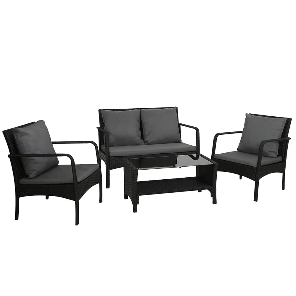 Meticulously crafted, our Gardeon 4-piece Rattan Outdoor Set comprises two armchairs, a two-seater and a matching table for a beautiful integrated look. Its presence will definitely add panache and style to your deck, patio or even living room. Made of handwoven UV-resistant PE wicker and a sturdy galvanised steel frame, this set not only looks stylish but is designed to last through all weather and the test of time. The 5mm thick tempered glass top with non-slip suction pads for the table also ensures strong and safe use with total peace of mind. Not least, the cushions and pillows on the seats are thick and well-padded to provide ultimate comfort and are suitable for all-weather use as well. And the covers are even removable and washable to maintain their pristine appearance. With so much going for it, the outdoor set certainly deserves its coveted space in your lovely backyard. Or even indoors for a unique presence.