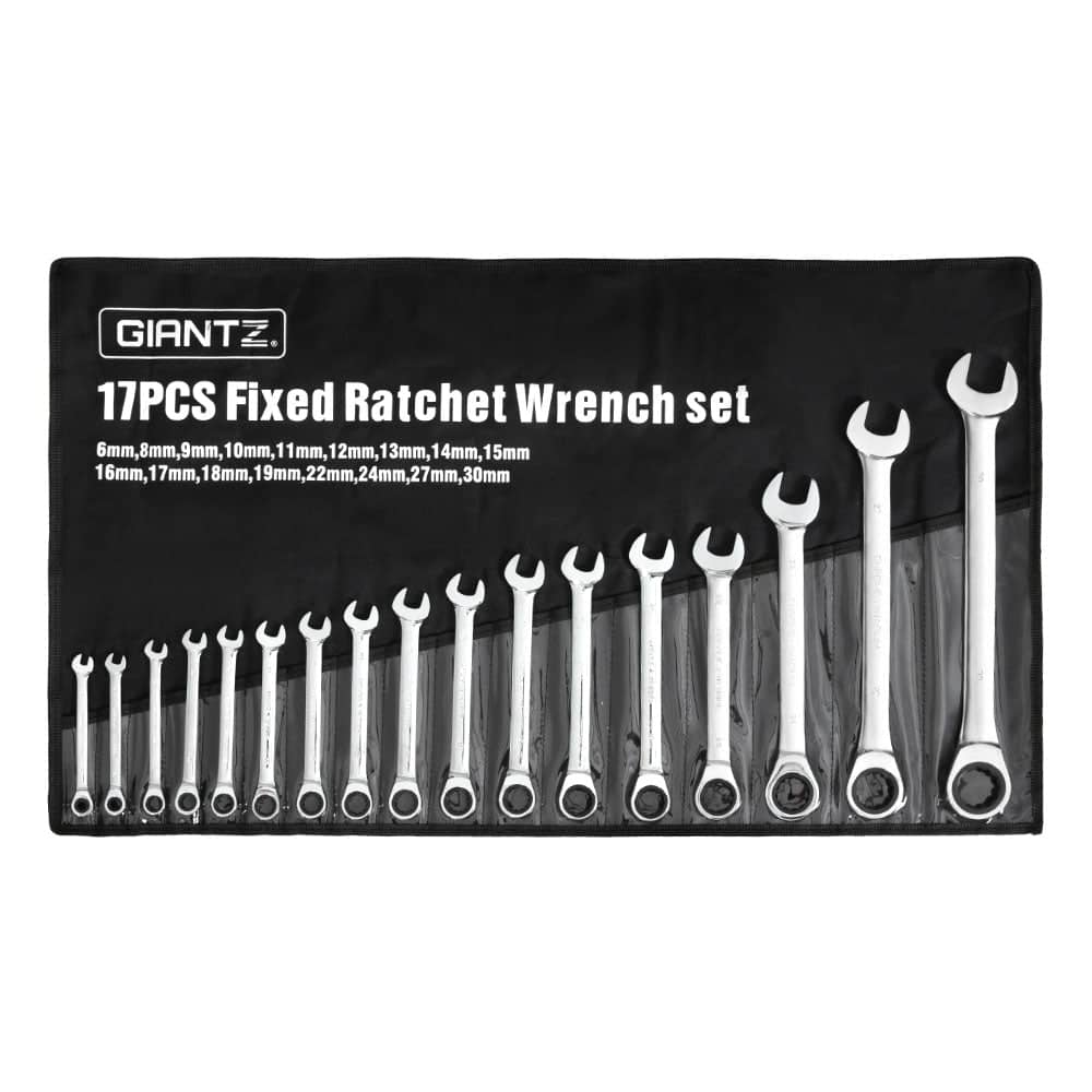 Giantz 17 PCS 6MM-30MM Ratchet Spanner Set Metric Open CR-V w/ Rolling Pouch