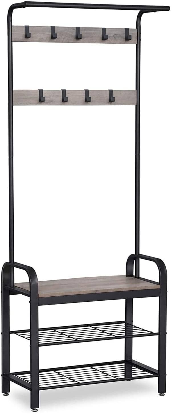 - A Perch For Your Shoes: This hat and coat stand not only has 9 sturdy hooks and a clothes rail at the top, but it also offers two metal wire shelves for shoes and a sturdy bench that you can comfortably sit on while you put them on