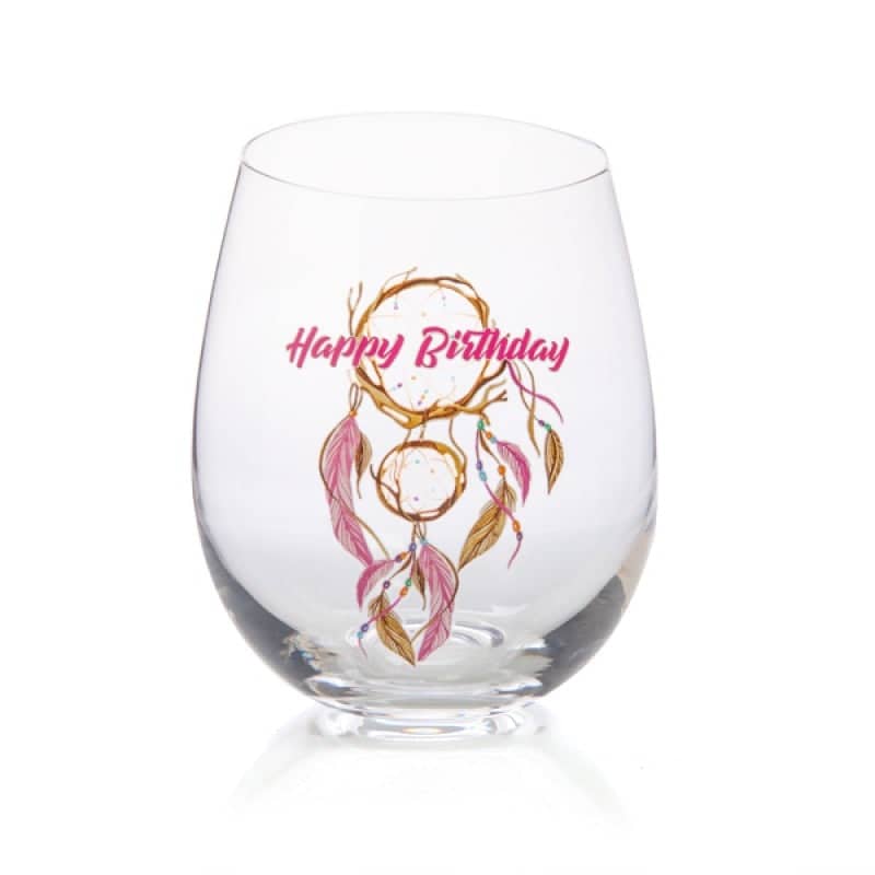 Hand-blown stemless wine glass featuring a whimsical dreamcatcher