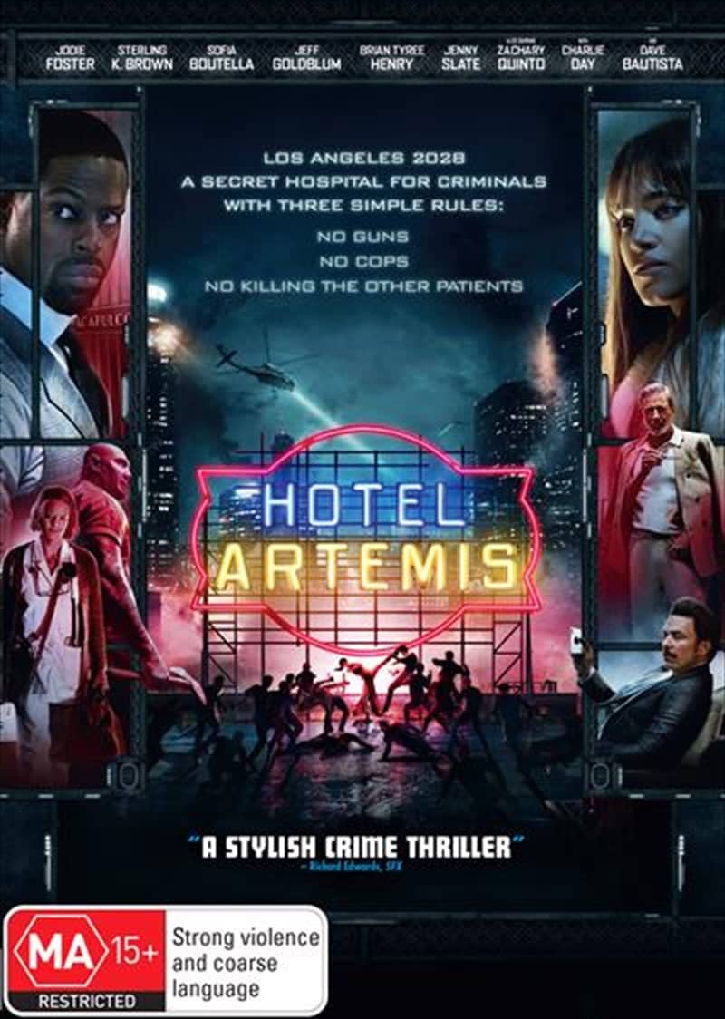 Set in riot-torn, near-future Los Angeles, HOTEL ARTEMIS is an original, high-octane action-thriller starring Jodie Foster as The Nurse, who runs a secret, members-only hospital for criminals. Jodie Foster is joined by an all-star cast that includes Sterling K. Brown, Sofia Boutella, Jeff Goldblum, Brian Tyree Henry, Jenny Slate, Zachary Quinto, Charlie Day, and Dave Bautista.