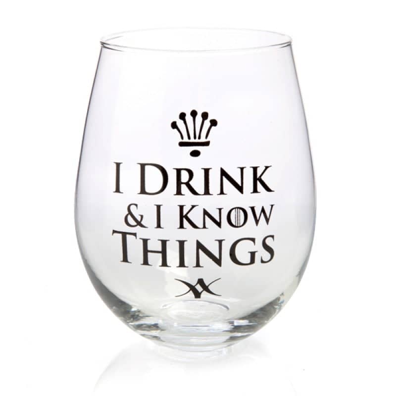 Black decal reads 'I Drink and I Know Things' with regal symbols